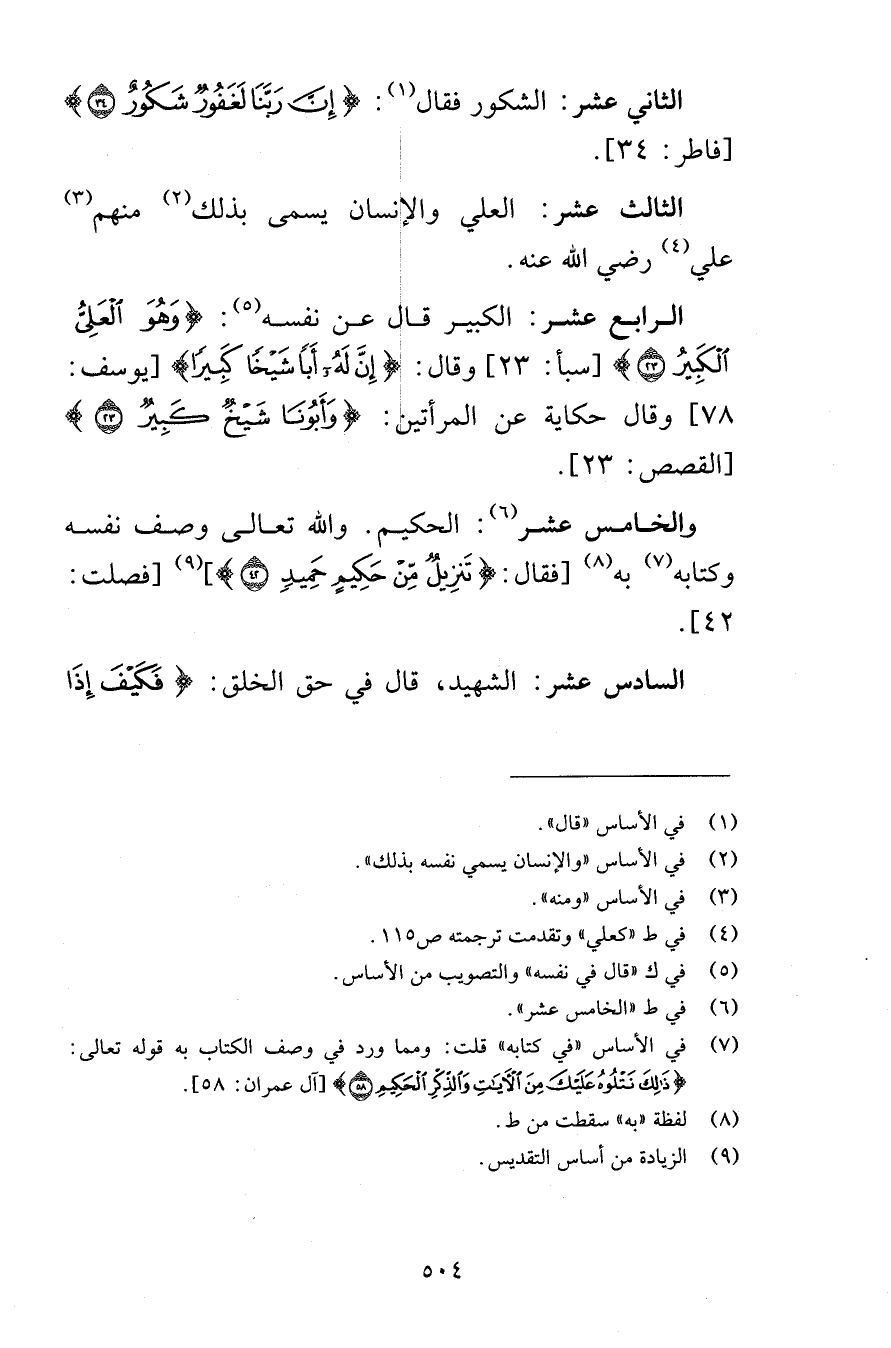 الثاني عشر الشكور فقال إِنَّ رَبَّنَا لَغَفُورٌ شَكُورٌ {34} [فاطر 34] الثالث عشر العلي والإنسان يسمى بذلك منهم علي رضي الله عنه الرابع عشر الكبير قال عن نفسه وَهُوَ الْعَلِيُّ الْكَبِيرُ {23} [سبأ 23] وقال إِنَّ لَهُ أَباً شَيْخاً كَبِيراً [يوسف 78] وقال حكاية عن المرأتين وَأَبُونَا شَيْخٌ كَبِيرٌ {23} [القصص 23] والخامس عشر الحكيم والله تعالى وصف نفسه في كتابه به فقال تَنزِيلٌ مِّنْ حَكِيمٍ حَمِيدٍ {42} [فصلت 42] السادس عشر الشهيد قال في حق الخلق فَكَيْفَ إِذَا