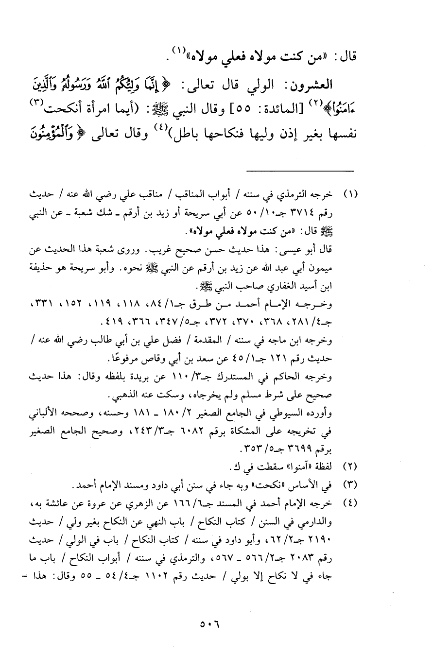 قال من كنت مولاه فعلي مولاه العشرون الولي قال تعالى إِنَّمَا وَلِيُّكُمُ اللهُ وَرَسُولُهُ وَالَّذِينَ آمَنُواْ [المائدة 55] وقال النبي صلى الله عليه وسلم أيما امرأة أنكحت نفسها بغير إذن وليها فنكاحها باطل وقال تعالى وَالْمُؤْمِنُونَ