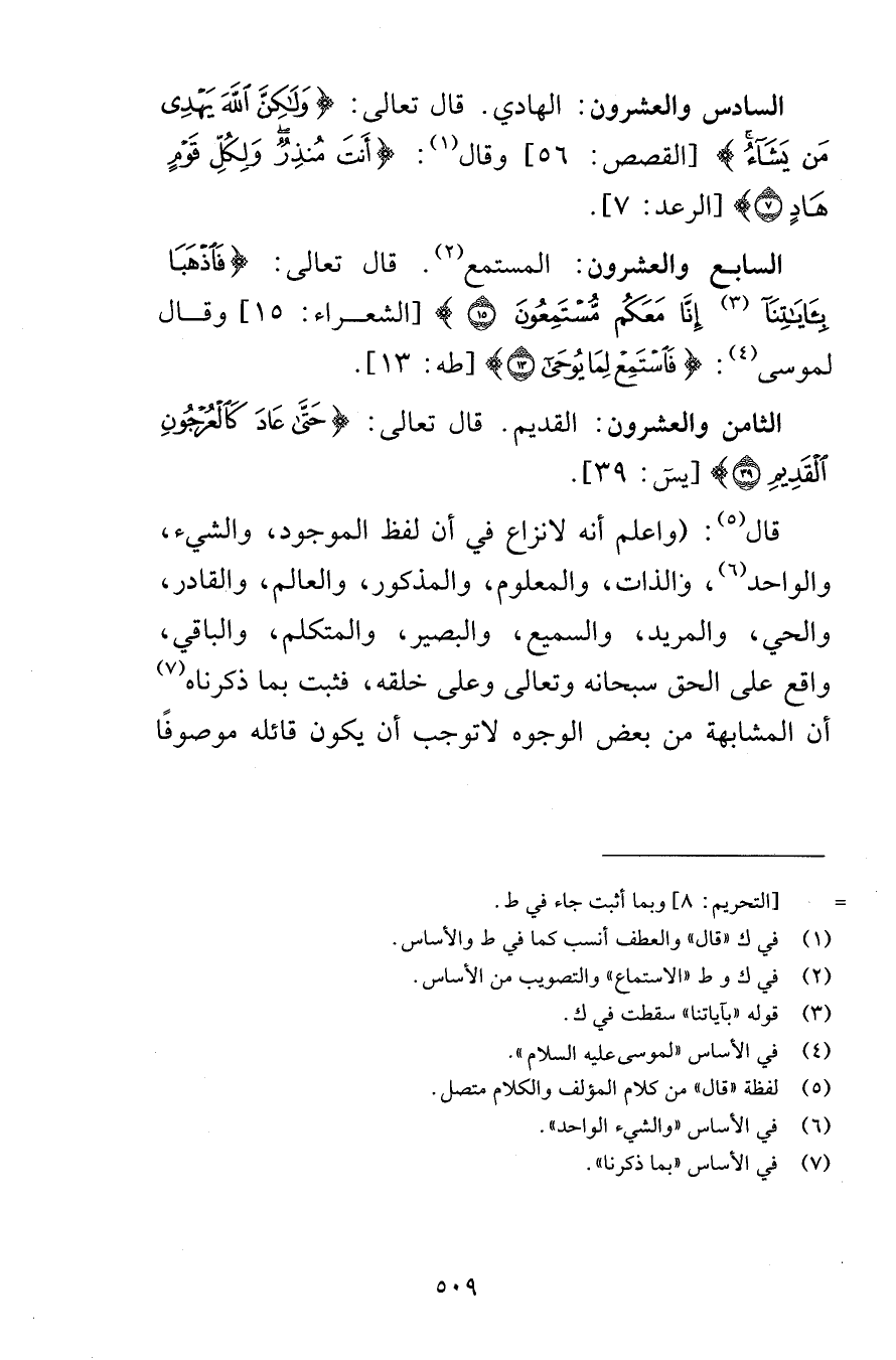 السادس والعشرون الهادي قال تعالى وَلَكِنَّ اللَّهَ يَهْدِي مَن يَشَاءُ [القصص 56] وقال إِنَّمَا أَنتَ مُنذِرٌ وَلِكُلِّ قَوْمٍ هَادٍ {7} [الرعد 7] السابع والعشرون المستمع قال تعالى فَاذْهَبَا بِآيَاتِنَا إِنَّا مَعَكُم مُّسْتَمِعُونَ {15} [الشعراء 15] وقال لموسى فَاسْتَمِعْ لِمَا يُوحَى {13} [طه 13] الثامن والعشرون القديم قال تعالى حَتَّى عَادَ كَالْعُرْجُونِ الْقَدِيمِ {39} [يس 39] قال واعلم أنه لانزاع في أن لفظ الموجود والشيء والواحد والذات والمعلوم والمذكور والعالم والقادر والحي والمريد والسميع والبصير والمتكلم والباقي واقع على الحق سبحانه وتعالى وعلى خلقه فثبت بما ذكرناه أن المشابهة من بعض الوجوه لاتوجب أن يكون قائله موصوفًا