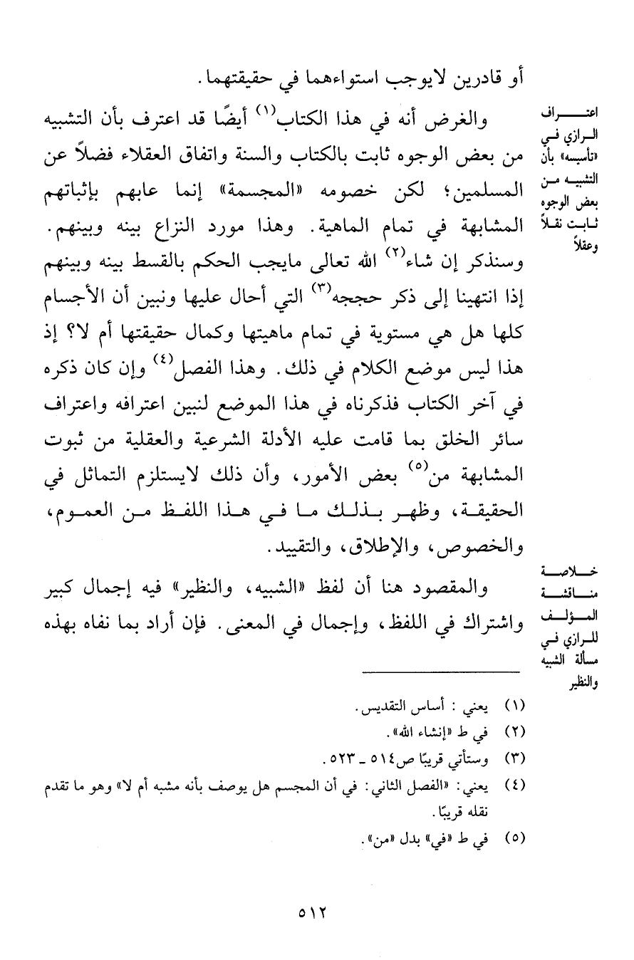 أو قادرين لايوجب استواءهما في حقيقتهما والغرض انه في هذا الكتاب أيضًا قد اعترف بأن التشبيه من بعض الوجوه ثابت بالكتاب والسنة واتفاق العقلاء فضلاً عن المسلمين لكن خصومه المجسمة إنما عابهم بإثباتهم المشابهة في تمام الماهية وهذا مورد النزاع بينه وبينهم وسنذكر إن شاء الله تعالى مايجب الحكم بالقسط بينه وبينهم إذا انتهينا إلى ذكر حججه التي أحال عليها ونبين أن الأجسام كلها هل هي مستوية في تمام ماهيتها وكمال حقيقتها أم لا إذ هذا ليس موضع الكلام في ذلك وهذا الفصل وإن كان ذكره في آخر الكتاب فذكرناه في هذا الموضع لنبين اعترافه واعتراف سائر الخلق بما قامت عليه الأدلة الشرعية والعقلية من ثبوت المشابهة من بعض الأمور وأن ذلك لايستلزم التماثل في الحقيقة وظهر بذلك ما في هذا اللفظ من العموم والخصوص والإطلاق والتقييد والمقصود هنا أن لفظ الشبيه والنظير فيه إجمال كبير واشتراك في اللفظ وإجمال في المعنى فإن أراد بما نفاه بهذه