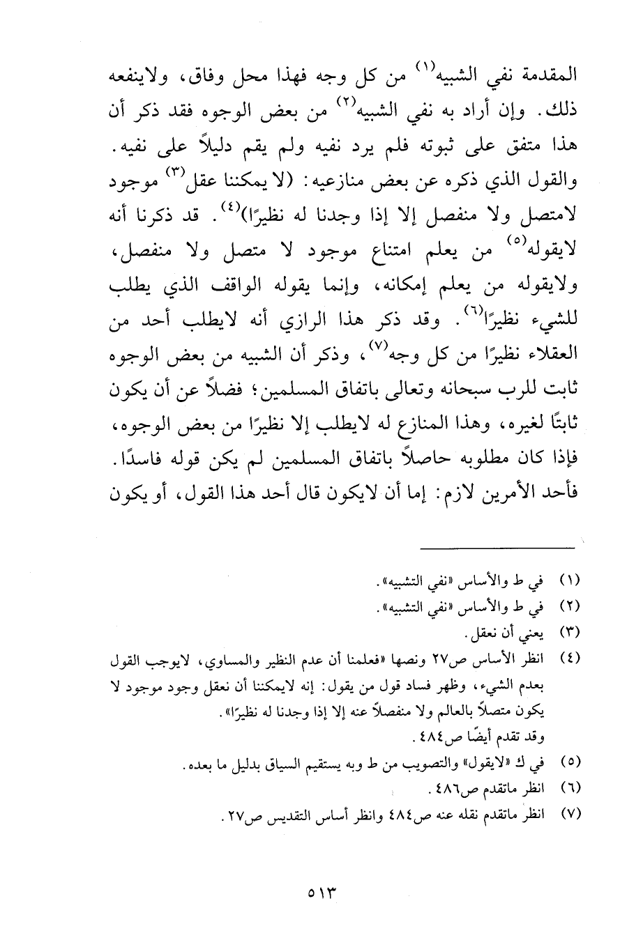 المقدمة نفي الشبيه من كل وجه فهذا محل وفاق ولاينفعه ذلك وإن أراد به نفي الشبيه من بعض الوجوه فقد ذكر أن هذا متفق على ثبوته فلم يرد نفيه ولم يقم دليلاً على نفيه والقول الذي ذكره عن بعض منازعيه لا يمكننا عقل موجود لامتصل ولا منفصل إلا إذا وجدنا له نظيرًا قد ذكرنا أنه لايقوله من يعلم امتناع موجود لا متصل ولا منفصل ولايقوله من يعلم إمكانه وإنما يقوله الواقف الذي يطلب للشيء نظيرًا وقد ذكر هذا الرازي أنه لايطلب أحد من العقلاء نظيرًا من كل وجه وذكر أن الشبيه من بعض الوجوه ثابت للرب سبحانه وتعالى باتفاق المسلمين فضلاً عن أن يكون ثابتًا لغيره وهذا المنازع له لايطلب إلا نظيرًا من بعض الوجوه فإذا كان مطلوبه حاصلاً باتفاق المسلمين لم يكن قوله فاسدًا فأحد الأمرين لازم إما أن لايكون قال أحد هذا القول أو يكون