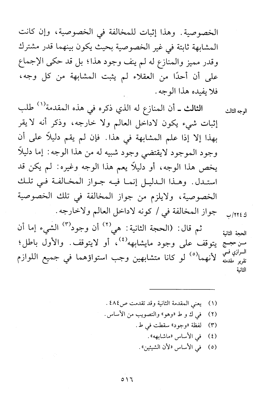 الخصوصية وهذا إثبات للمخالفة في الخصوصية وإن كانت المشابهة ثابتة في غير الخصوصية بحيث يكون بينهما قدر مشترك وقدر مميز والمنازع له لم ينف وجود هذا بل قد حكى الإجماع على أن أحدًا من العقلاء لم يثبت المشابهة من كل وجه فلا يفيده هذا الوجه الثالث أن المنازع له الذي ذكره في هذه المقدمة طلب إثبات شيء يكون لاداخل العالم ولا خارجه وذكر أنه لا يقر بهذا إلا إذا علم المشابهة في هذا فإن لم يقم دليلاً على أن وجود موجود لايقتضي وجود شبيه له من هذا الوجه إما دليلاً يخص هذا الوجه أو دليلاً يعم هذا الوجه وغيره لم يكن قد استدل وهذا الدليل إنما فيه جواز المخالفة في تلك الخصوصية ولايلزم من جواز المخالفة في تلك الخصوصية جواز المخالفة في كونه لاداخل العالم ولاخارجه ثم قال الحجة الثانية هي أن وجود الشيء إما أن يتوقف على وجود مايشابهه أو لايتوقف والأول باطل لأنهما لو كانا متشابهين وجب استواؤهما في جميع اللوازم