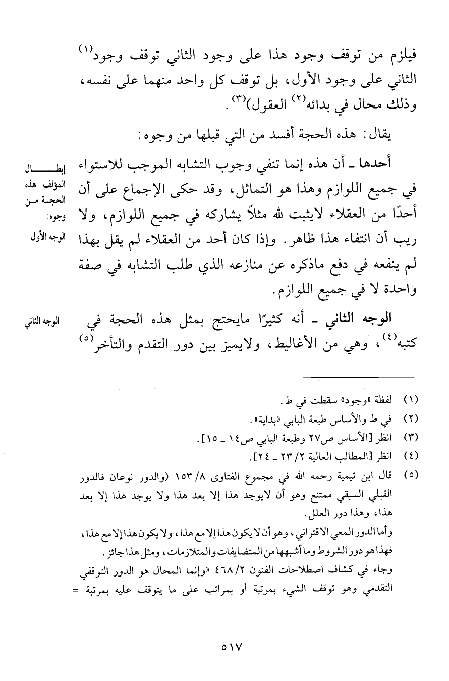فيلزم من توقف وجود هذا على وجود الثاني توقف وجود الثاني على وجود الأول بل توقف كل واحد منهما على نفسه وذلك محال في بدائه العقول يقال هذه الحجة أفسد من التي قبلها من وجوه أحدها أن هذه إنما تنفي وجوب التشابه الموجب للاستواء في جميع اللوازم وهذا هو التماثل وقد حكى الإجماع على أن أحدًا من العقلاء لايثبت لله مثلاً يشاركه في جميع اللوازم ولا ريب أن انتفاء هذا ظاهر وإذا كان أحدًا من العقلاء لم يقل بهذا لم ينفعه في دفع ماذكره عن منازعه الذي طل التشابه في صفة واحدة لا في جميع اللوازم الوجه الثاني أنه كثيرًا مايحتج بمثل هذه الحجة في كتبه وهي من الأغاليط ولايميز بين دور التقدم والتأخر
