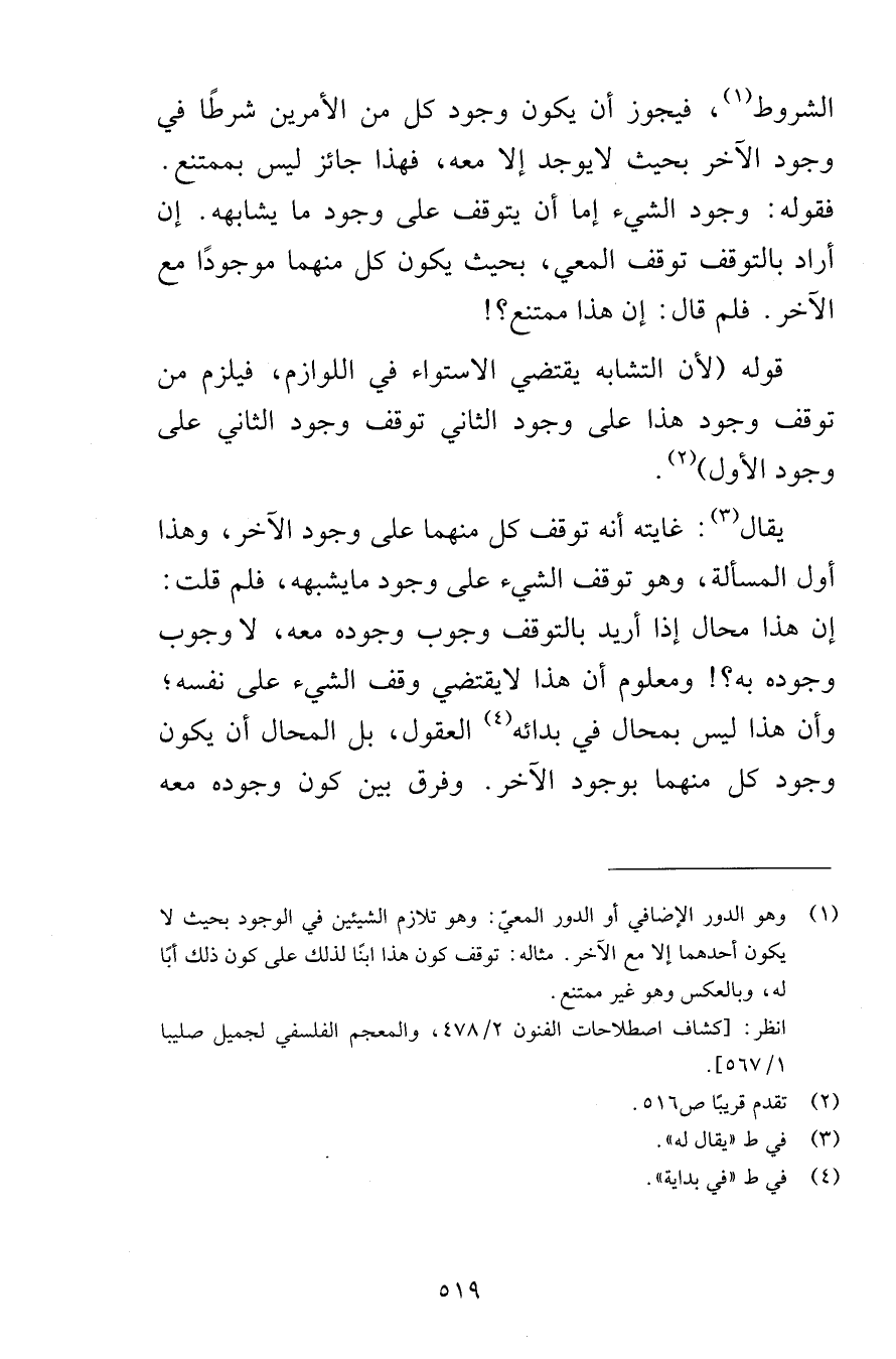 الشروط فيجوز أن يكون وجود كل من الأمرين شرطًا في وجود الآخر بحيث لايوجد إلا معه فهذا جائز ليس بممتنع فقوله وجود الشيء إما أن يتوقف على وجود ما يشابهه إن أراد بالتوقف توقف المعي بحيث يكون كل منهما موجودًا مع الآخر فلم قال إن هذا ممتنع قوله لأن التشابه يقتضي الاستواء في اللوازم فيلزم من توقف جود هذا على وجود الثاني توقف وجود الثاني على وجود الأول يقال غايته أنه توقف كل منهما على وجود الآخر وهذا أول المسألة وهو توقف الشيء على وجود مايشبهه فلم قلت إن هذا محال إذا أريد بالتوقف وجوب وجوده معه لا وجوب وجوده به ومعلوم أن هذا لايقتضي وقف الشيء على نفسه وأن هذا ليس بمحال في بدائه العقول بل المحال أن يكون وجود كل منهما بوجود الآخر وفرق بين كون وجوده معه