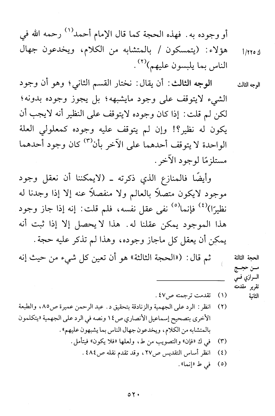 أو وجوده به فهذه الحجة كما قال الإمام أحمد رحمه الله في هؤلاء يتمسكون بالمتشابه من الكلام ويخدعون جهال الناس بما يلبسون عليهم الوجه الثالث أن يقال نختار القسم الثاني وهو أن وجود الشيء لايتوقف على وجود مايشبهه بل يجوز وجوده بدونه لكن لم قلت إذا كان وجوده لايتوقف على النظير أنه لايجب أن يكون له نظير وإن لم يتوقف عليه وجوده كمعلولي العلة الواحدة لا يتوقف أحدهما على الآخر بأن كان وجود احدهما مستلزمًا لوجود الآخر وأيضًا فالمنازع الذي ذكرته لايمكننا أن نعقل وجود موجود لايكون متصلاً بالعالم ولا منفصلاً عنه إلا إذا وجدنا له نظيرًا فإنما نفى عقل نفسه فلم قلت إنه إذا جاز وجود هذا الموجود يمكن عقلنا له وهذا لا يحصل إلا إذا ثبت انه يمكن أن يعقل كل ماجاز وجوده وهذا لم تذكر عليه حجة ثم قال الحجة الثالثة هو أن تعين كل شيء من حيث إنه