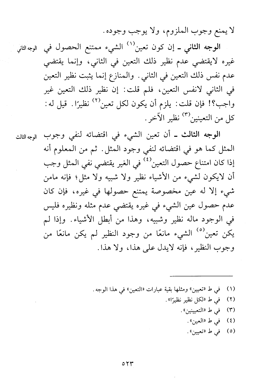 لا يمنع وجوب الملزوم ولا يوجب وجوده الوجه الثاني إن كون تعين الشيء ممتنع الحصول في غيره لايقتضي عدم نظير ذلك التعين في الثاني وإنما يقتضي عدم نفس ذلك التعين في الثاني والمنازع إنما يثبت نظير التعين في الثاني لانفس التعين فلم قلت إن نظير ذلك التعين غير واجب فإن قلت يلزم أن يكون لكل تعين نظيرًا قيل له كل من التعينين نظير الآخر الوجه الثالث أن تعين الشيء في اقتضائه لنفي وجوب المثل كما هو في اقتضائه لنفي وجود المثل ثم من المعلوم أنه إذا كان امتناع حصول التعين في الغير يقتضي نفي المثل وجب أن لايكون لشيء من الأشياء نظير ولا شبيه ولا مثل فإنه ما من شيء إلا له عين مخصوصة يمتنع حصولها في غيره فإن كان عدم حصول عين الشيء في غيره يقتضي عدم مثله ونظيره فليس في الوجود ماله نظير وشبيه وهذا من أبطل الأشياء وإذا لم يكن تعين الشيء مانعًا من وجود النظير لم يكن مانعًا من وجوب النظير فإنه لايدل على هذا ولا هذا