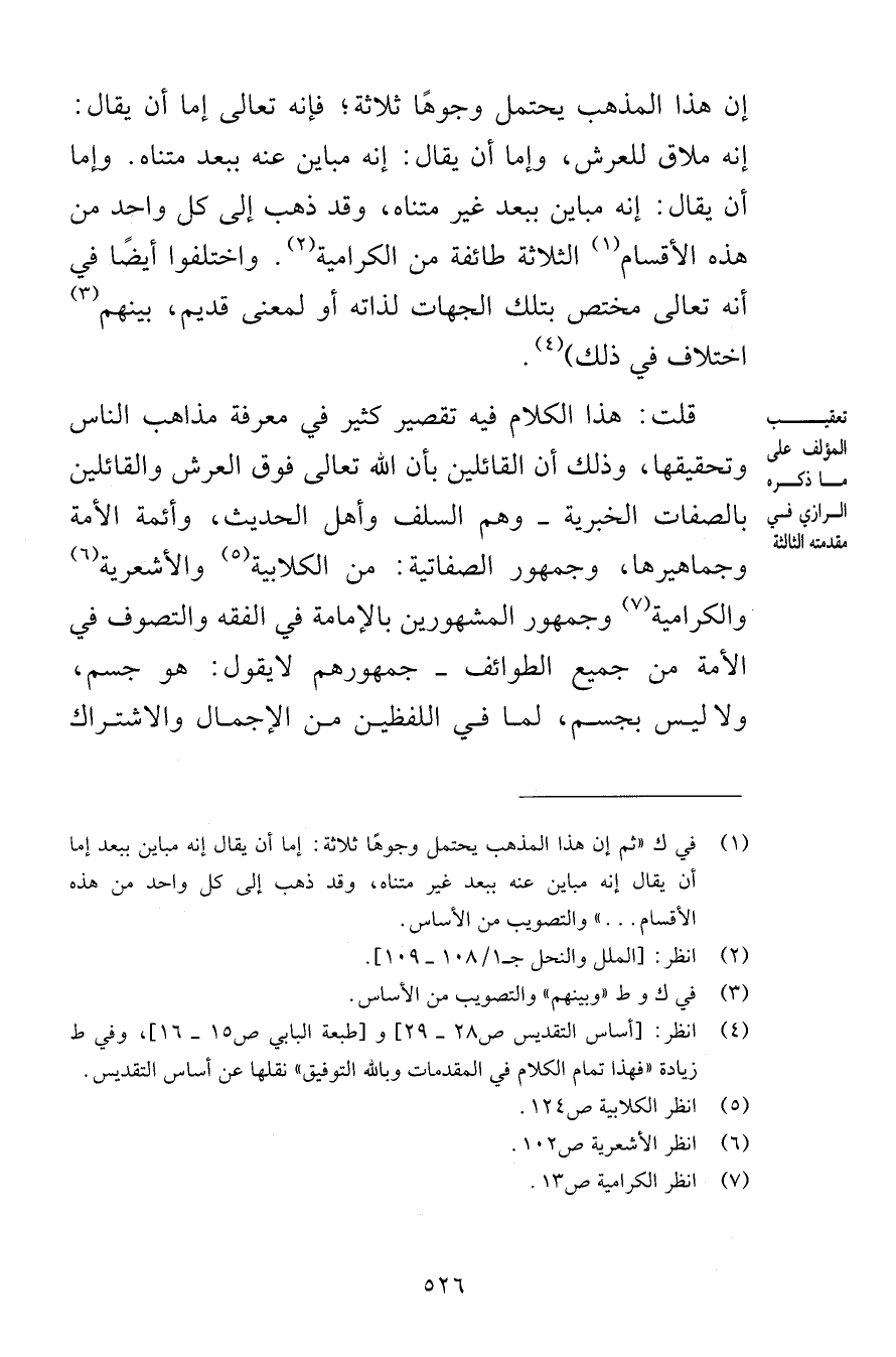 إن هذا المذهب يحتمل وجوهًا ثلاثة فإنه تعالى إما أن يقال إنه ملاق للعرش وإما أن يقال إنه مباين عنه ببعد متناه وإما أن يقال إنه مباين ببعد غير متناه وقد ذهب إلى كل واحد من هذه الأقسام الثلاثة طائفة من الكرامية واختلفوا أيضًا في أنه تعالى مختص بتلك الجهات لذاته أو لمعنى قديم بينهم اختلاف في ذلك قلت هذا الكلام فيه تقصير كثير في معرفة مذاهب الناس وتحقيقها وذلك أن القائلين بأن الله تعالى فوق العرش والقائلين بالصفات الخبرية وهم السلف وأهل الحديث وأئمة الأمة وجماهيرها وجمهور الصفاتية من الكلابية والأشعرية والكرامية وجمهور المشهورين بالإمامة في الفقه والتصوف في الأمة من جميع الطوائف جمهورهم لايقول هو جسم ولا ليس بجسم لما في اللفظين من الإجمال والاشتراك