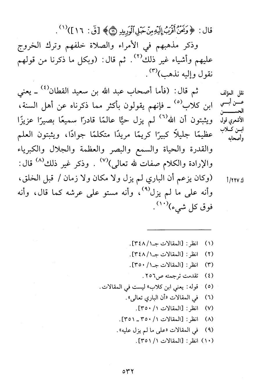 قال وَنَحْنُ أَقْرَبُ إِلَيْهِ مِنْ حَبْلِ الْوَرِيدِ {16} [ق 16] وذكر مذهبهم في الأمراء والصلاة خلفهم وترك الخروج عليهم وأشياء غير ذلك ثم قال وبكل ما ذكرنا من قولهم نقول وإليه نذهب ثم قال فأما أصحاب عبد الله بن سعيد القطان يعني ابن كلاب فإنهم يقولون بأكثر مما ذكرناه عن أهل السنة ويثبتون أن الله لم يزل حيًّا عالمًا قادرًا سميعًا بصيرًا عزيزًا عظيمًا جليلاً كبيرًا كريمًا مريدًا متكلمًا جوادًا ويثبتون العلم والقدرة والحياة والسمع والبصر والعظمة والجلال والكبرياء والإرادة والكلام صفات لله تعالى وذكر غير ذلك قال وكان يزعم أن الباري لم يزل ولا مكان ولا زمان قبل الخلق وأنه على ما لم يزل وأنه مستو على عرشه كما قال وأنه فوق كل شيء