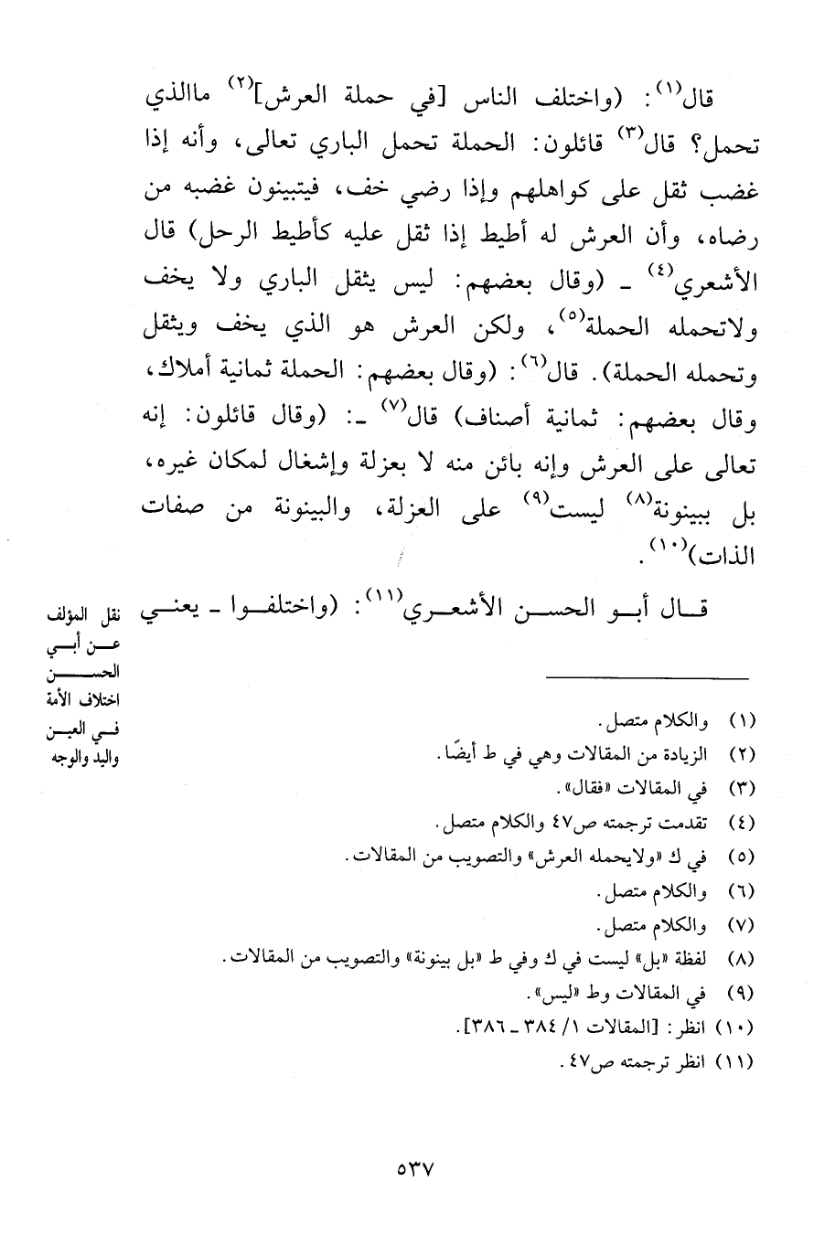 قال واختلف الناس في حملة العرش ماالذي تحمل قال قائلون الحملة تحمل الباري تعالى وأنه إذا غضب ثقل على كواهلهم وإذا رضي خف فيتبينون غضبه من رضاه وان العرش له أطيط إذا ثقل عليه كأطيط الرحل قال الأشعري وقال بعضهم ليس يثقل الباري ولا يخف ولاتحمله الحملة قال وقال بعضهم الحملة ثمانية أملاك وقال بعضهم ثمانية أصناف قال وقال قائلون إنه تعالى على العرش وإنه بائن منه لا بعزلة وإشغال لمكان غيره بل ببينونة ليست على العزلة والبينونة من صفات الذات قال أبو الحسن الأشعري واختلفوا يعني