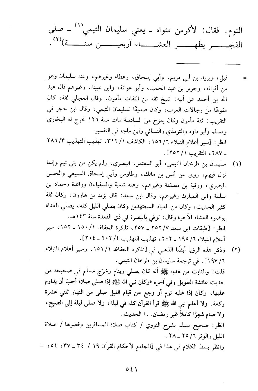 النوم فقال لأكرمن مثواه يعني سليمان التيمي صلى الفجر بطهر العشاء أربعين سنة