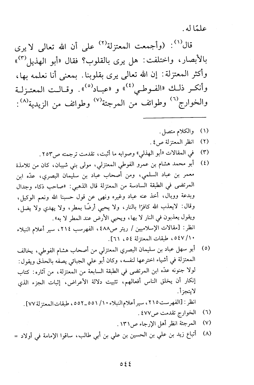 علمًا له قال وأجمعت المعتزلة على أن الله تعالى لا يرى بالأبصار واختلفت هل يرى بالقلوب فقال أبو الهذيل وأكثر المعتزلة إن الله تعالى يرى بقلوبنا بمعنى أنا نعلمه بها وأنكر ذلك الفوطي وعباد وقالت المعتزلة والخوارج وطوائف من المرجئة وطوائف من الزيدية