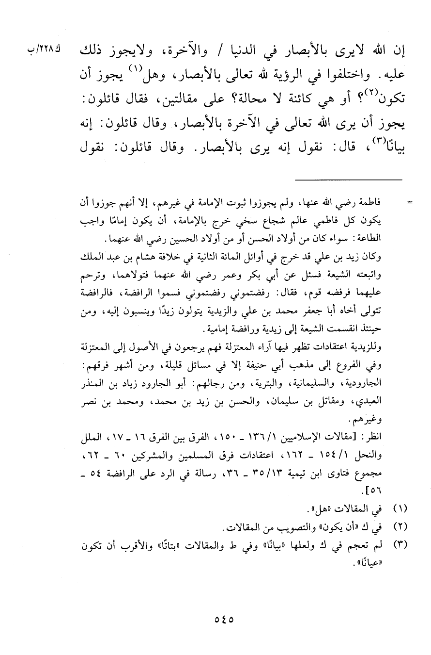 إن الله لايرى بالأبصار في الدنيا والآخرة ولايجوز ذلك عليه واختلفوا في الرؤية لله تعالى بالأبصار وهل يجوز أن تكون أو هي كائنة لا محالة على مقالتين فقال قائلون يجوز أن يرى الله تعالى في الآخرة بالأبصار وقال قائلون إنه بيانًا قال نقول إنه يرى بالأبصار وقال قائلون نقول