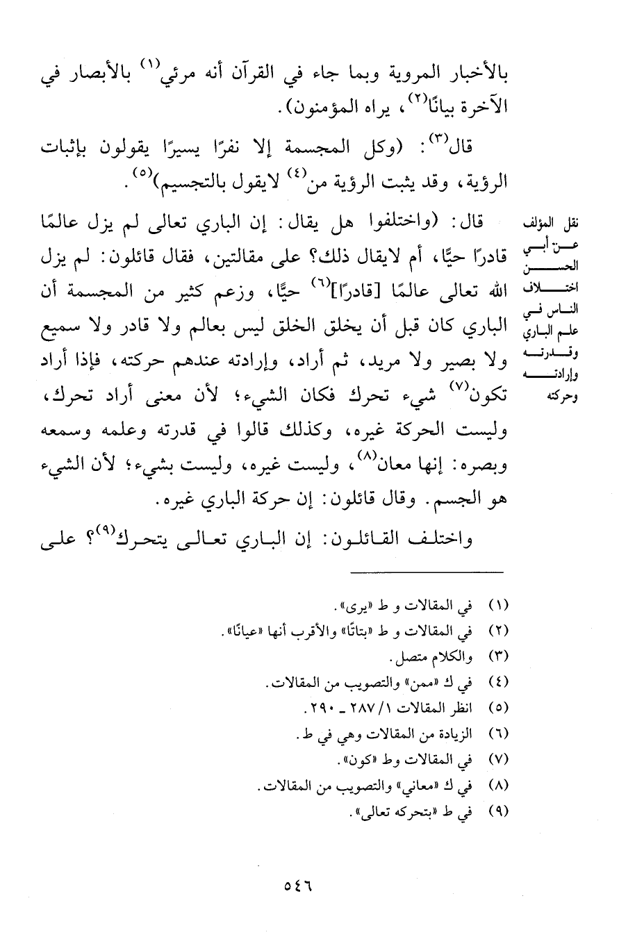 بالأخبار المروية وبما جاء في القرآن أنه مرئي بالأبصار في الآخرة بيانًا يراه المؤمنون قال وكل المجسمة إلا نفرًا يسيرًا يقولون بإثبات الرؤية وقد يثبت الرؤية من لايقول بالتجسيم قال واختلفوا هل يقال إن الباري تعالى لم يزل عالمًا قادرًا حيًّا أم لايقال ذلك على مقالتين فقال قائلون لم يزل الله تعالى عالمًا قادرًا حيًّا وزعم كثير من المجسمة أن الباري كان قبل أن يخلق الخلق ليس بعالم ولا قادر ولا سميع ولا بصير ولا مريد ثم أراد وإرادته عندهم حركته فإذا أراد تكون شيء تحرك فكان الشيء لأن معنى أراد تحرك وليست الحركة غيره وكذلك قالوا في قدرته وعلمه وسمعه وبصره إنها معان وليست غيره وليست بشيء لأن الشيء هو الجسم وقال قائلون إن حركة الباري غيره واختلف القائلون إن الباري يتحرك على