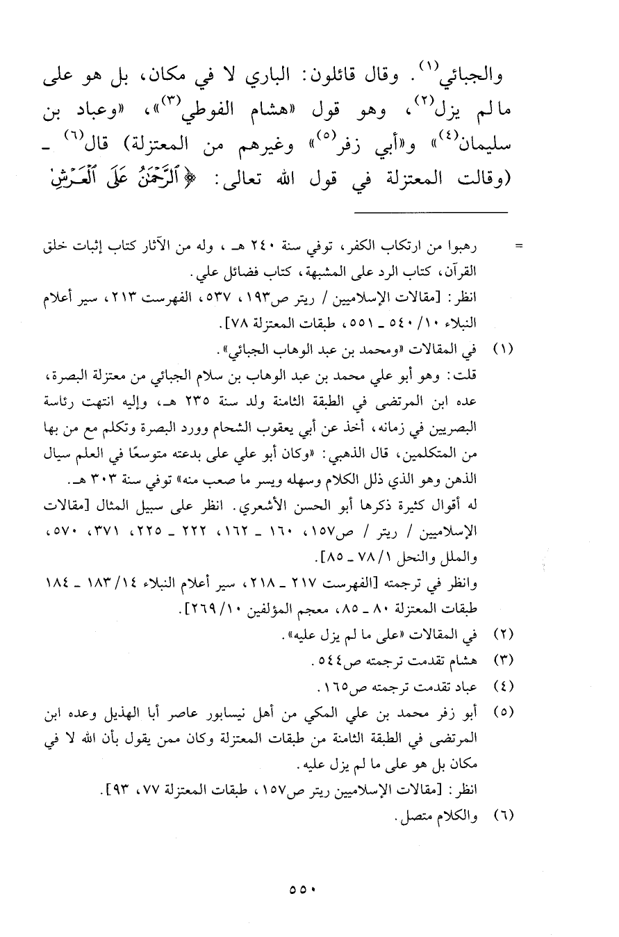 والجبائي وقال قائلون الباري لا في مكان بل هو على ما لم يزل وهو قول هشام الفوطي وعباد بن سليمان وأبي زفر وغيرهم من المعتزلة قال وقالت المعتزلة في قول الله تعالى الرَّحْمَنُ عَلَى الْعَرْشِ
