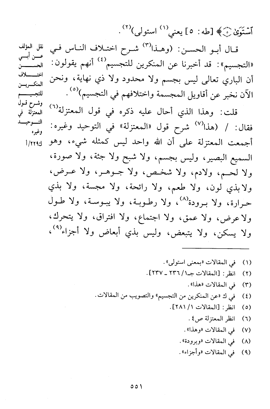 اسْتَوَى {5} [طه 5] يعنى استولى قال أبو الحسن وهذا شرح اختلاف الناس في التجسيم قد أخبرنا عن المنكرين للتجسيم أنهم يقولون أن الباري تعالى ليس بجسم ولا محدود ولا ذي نهاية ونحن الآن نخبر عن أقاويل المجسمة واختلافهم في التجسيم قلت هذا الذي أحال عليه ذكره في قول المعتزلة فقال هذا شرح قول المعتزلة في التوحيد وغيره أجمعت المعتزلة على أن الله واحد ليس كمثله شيء وهو السميع البصير وليس بجسم ولا شبح ولا جثة ولا صورة ولا لحم ولا دم ولا شخص ولا جوهر ولا عرض ولا بذي لون ولا طعم ولا رائحة ولا مجسة ولا بذي حرارة ولا برودة ولا رطوبة ولا يبوسة ولا طول ولا عرض ولا عمق ولا اجتماع ولا افتراق ولا يتحرك ولا يسكن ولا يتبعض وليس بذي أبعاض ولا أجزاء