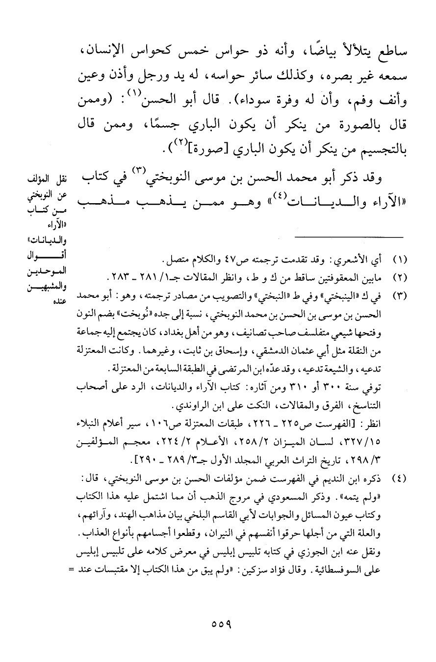 ساطع يتلألأ بياضًا وأنه ذو حواس خمس كحواس الإنسان سمعه غير بصره وكذلك سائر حواسه له يد ورجل وأذن وعين وأنف وفم وأن له وفرة سوداء قال أبو الحسن وممن قال بالتجسيم من ينكر أن يكون الباري صورة وقد ذكر أبو محمد الحسن بن موسى النوبختي في كتاب الآراء والديانات وهو ممن يذهب مذهب