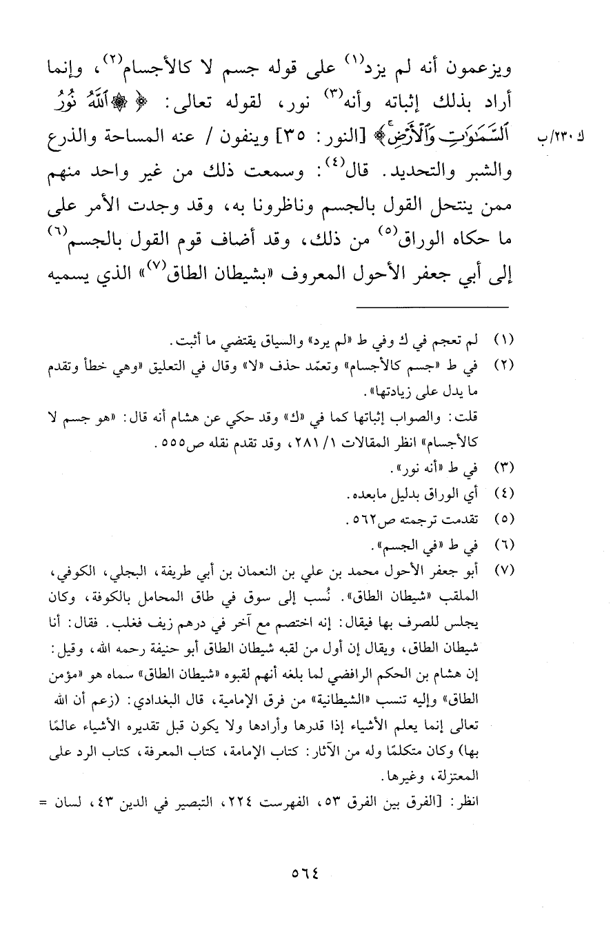 ويزعمون أنه لم يزد على قوله جسم لا كالأجسام وإنما أراد بذلك إثباته وأنه نور لقول تعالى اللَّهُ نُورُ السَّمَاوَاتِ وَالْأَرْضِ [النور 35] وينفون عنه المساحة والذرع والشبر والتحديد قال وسمعت ذلك من غير واحد منهم ممن ينتحل القول بالجسم وناظرونا به وقد وجدت الأمر على ما حكاه الوراق من ذلك وقد أضاف قوم القول بالجسم وإلى أبي جعفر الأحول المعروف بشيطان الطاق الذي يسميه
