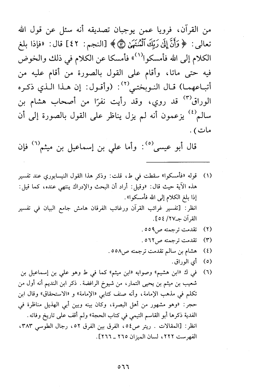 من القرآن فرويا عمن يوجبان تصديقه أنه سئل عن قول الله تعالى وَأَنَّ إِلَى رَبِّكَ الْمُنتَهَى {42} [النجم 42] قال فإذا بلغ الكلام إلى الله فأمسكوا فأمسكا عن الكلام في ذلك والخوض فيه حتى ماتا وأقام على القول بالصورة من أقام عليه من أتباعهما قال النوبختي وأقول أن هذا الذي ذكره الوراق قد روي وقد رأيت نفرًا من أصحاب هشام بن سالم يزعمون أنه لم يزل يناظر على القول بالصورة إلى أن مات قال أبو عيسى وأما علي بن إسماعيل بن ميثم فإن