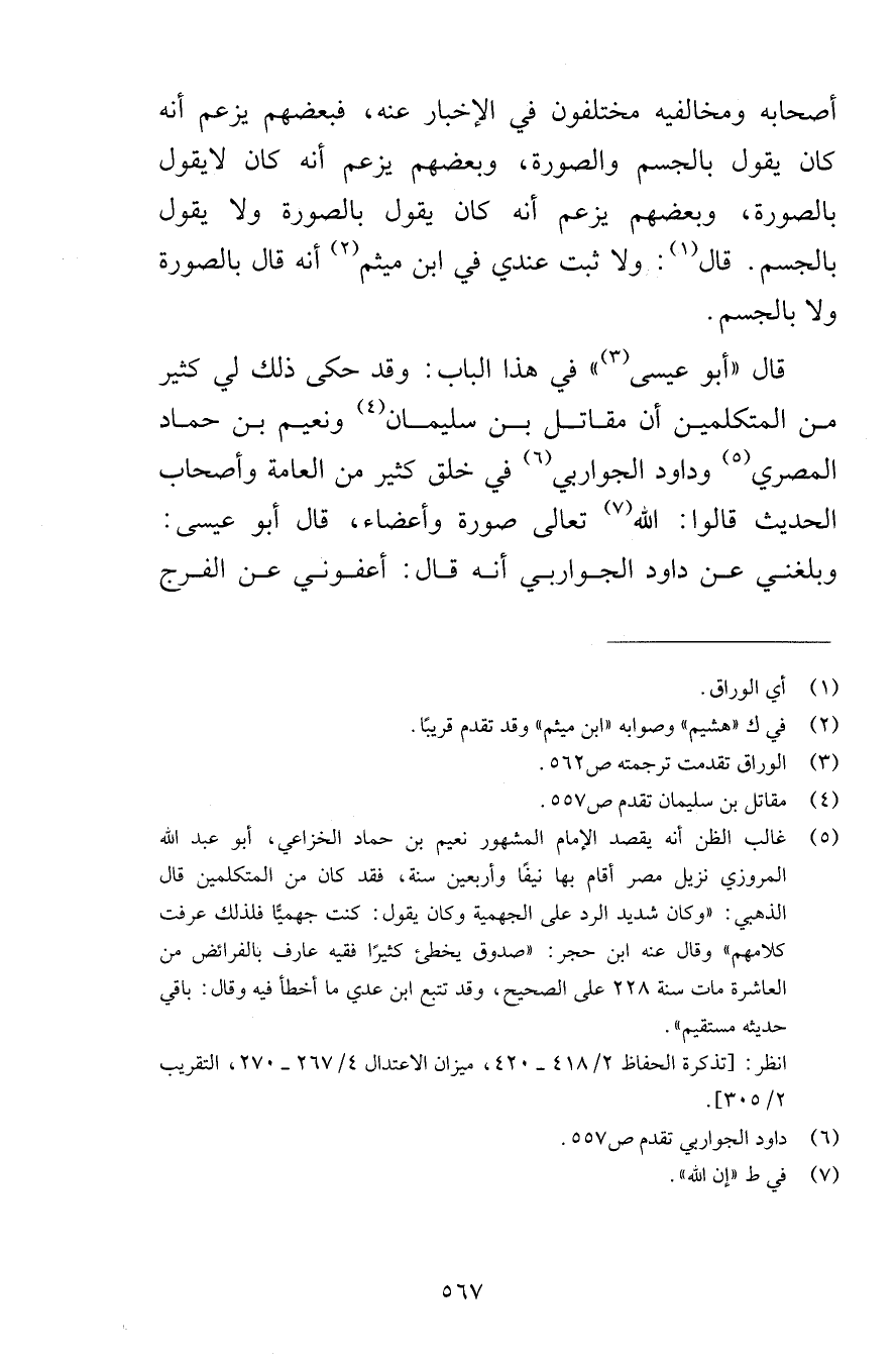 أصحابه ومخالفيه مختلفون في الإخبار عنه فبعضهم يزعم أنه كان يقول بالجسم والصورة وبعضهم يزعم أنه كان لايقول بالصورة وبعضهم يزعم أنه كان يقول بالصورة ولا يقول بالجسم قال ولا ثبت عندي في ابن ميثم أنه قال بالصورة ولا بالجسم قال أبو عيسى في هذا الباب وقد حكى ذلك لي كثير من المتكلمين أن مقاتل بن سليمان ونعيم بن حماد المصري وداود الجواربي في خلق كثير من العامة وأصحاب الحديث قالوا الله تعالى في صورة وأعضاء قال أبو عيسى وبلغني عن داود الجواربي أنه قال أعفوني عن الفرج