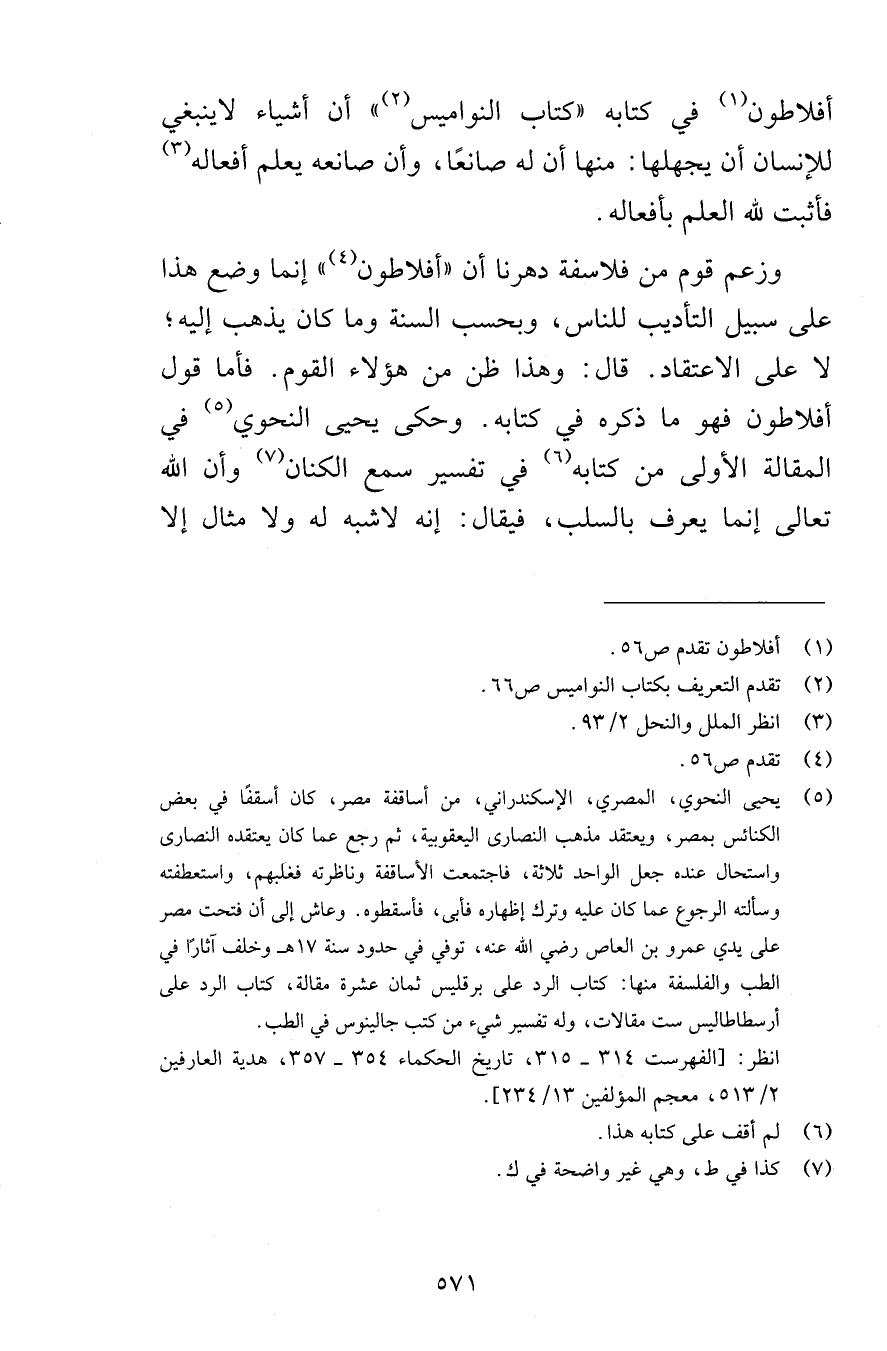 أفلاطون في كتابه كتاب النواميس أن أشياء لاينبغي للإنسان أن يجهلها منها أن له صانعًا وأن صانعه يعلم أفعاله فأثبت لله العلم بأفعاله وزعم قوم من فلاسفة دهرنا أن أفلاطون إنما وضع هذا على سبيل التأديب للناس وبحسب السنة وما كان يذهب إليه لا على الاعتقاد قال وهذا ظن من هؤلاء القوم فأما قول أفلاطون فهو ما ذكره في كتابه في تفسير سمع الكنان وأن الله تعالى إنما يعرف بالسلب فيقال إنه لاشبه له ولا مثال إلا