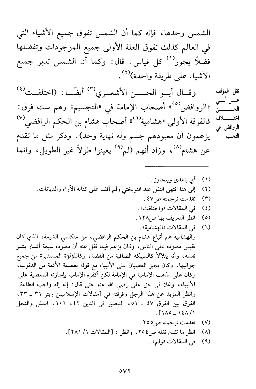 الشمس وحدها فإنه كما أن الشمس تفوق جميع الأشياء التي في العالم كذلك تفوق العلة الأولى جميع الموجودات وتفضلها فضلاً يجوز كل قياس قال وكما أن الشمس تدبر جميع الأشياء على طريقة واحدة وقال أبو الحسن الأشعري أيضًا اختلفت الروافض أصحاب الإمامة في التجسيم وهم ست فرق فالفرقة الأولى هشامية أصحاب هشام بن الحكم الرافضي يزعمون أن معبودهم جسم وله نهاية وحد وذكر مثل ما تقدم عن هشام وزاد أنهم لم يعينوا طولاً غير الطول وإنما