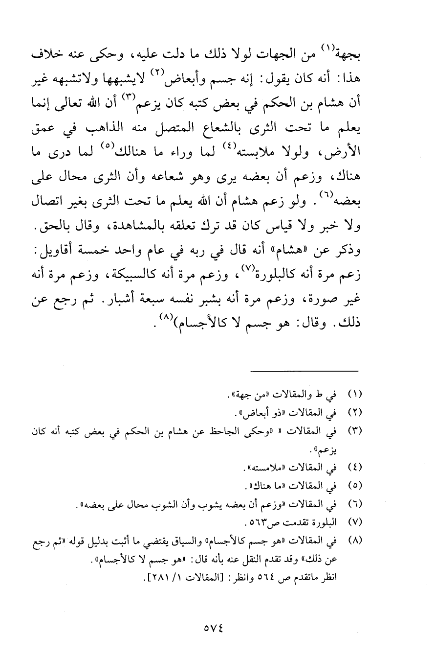 بجهة من الجهات لولا ذلك ما دلت عليه وحكى عنه خلاف هذا انه كان يقول إنه جسم وأبعاض لايشبهها ولاتشبهه غير أن هشام بن الحكم في بعض كتبه كان يزعم أن الله تعالى إنما يعلم ما تحت الثرى بالشعاع المتصل منه الذاهب في عمق الأرض ولولا ملابسته لما وراء ما هنالك لما درى ما هناك وزعم أن بعضه يرى وهو شعاعه وأن الثرى محال على بعضه ولو زعم هشام أن الله يعلم ما تحت الثرى بغير اتصال ولا خبر ولا قياس كان قد ترك تعلقه بالمشاهدة وقال بالحق وذكر عن هشام أنه قال في ربه في عام واحد خمسة أقاويل زعم مرة أنه كالبلورة وزعم مرة أنه كالسبيكة وزعم مرة أنه غير صورة وزعم مرة أنه بشبر نفسه سبعة أشبار ثم رجع عن ذلك وقال هو جسم لا كالأجسام