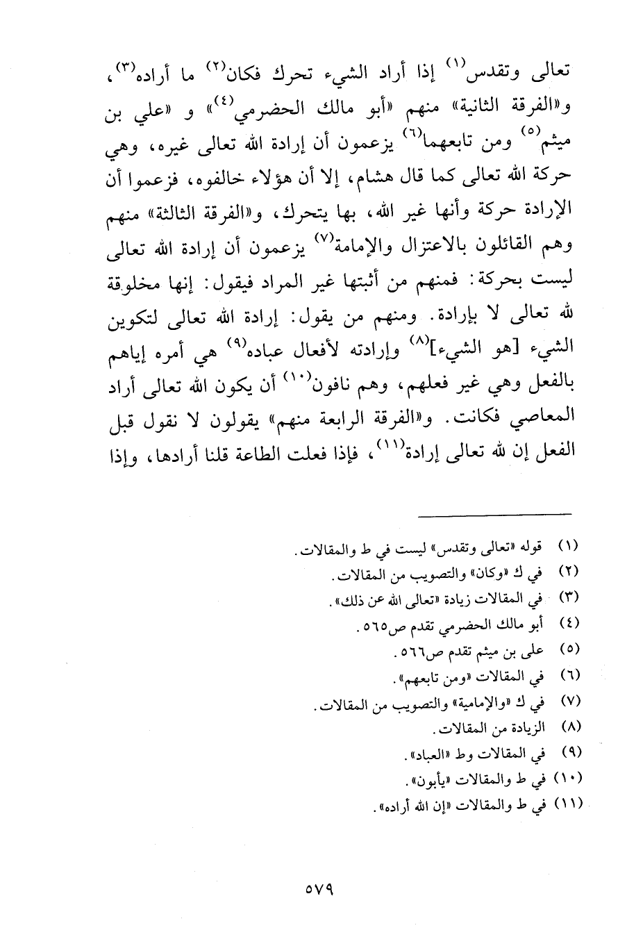 تعالى وتقدس إذا أراد الشيء تحرك فكان ما أراده والفرقة الثانية ومنهم أبو مالك الحضرمي وعلي بن ميثم ومن تابعهما يزعمون أن إرادة الله تعالى غيره وهي حركة الله تعالى كما قال هشام إلا أن هؤلاء خالفوه فزعموا أن الإرادة حركة وأنها غير الله بها يتحرك والفرقة الثالثة منهم وهم القائلون بالاعتزال والإمامة يزعمون أن إرادة الله تعالى ليست بحركة فمنهم من أثبتها غير المراد فيقول إنها مخلوقة لله تعالى لا بإرادة ومنهم من يقول إرادة الله تعالى لتكوين الشيء هو الشيء وإرادته لأفعال عباده هي أمره إياهم بالفعل وهي غير فعلهم وهم نافون أن يكون الله تعالى أراد المعاصي فكانت والفرقة الرابعة منهم يقولون لا نقول قبل الفعل إن لله تعالى إرادة فإذا فعلت الطاعة قلنا أرادها وإذا