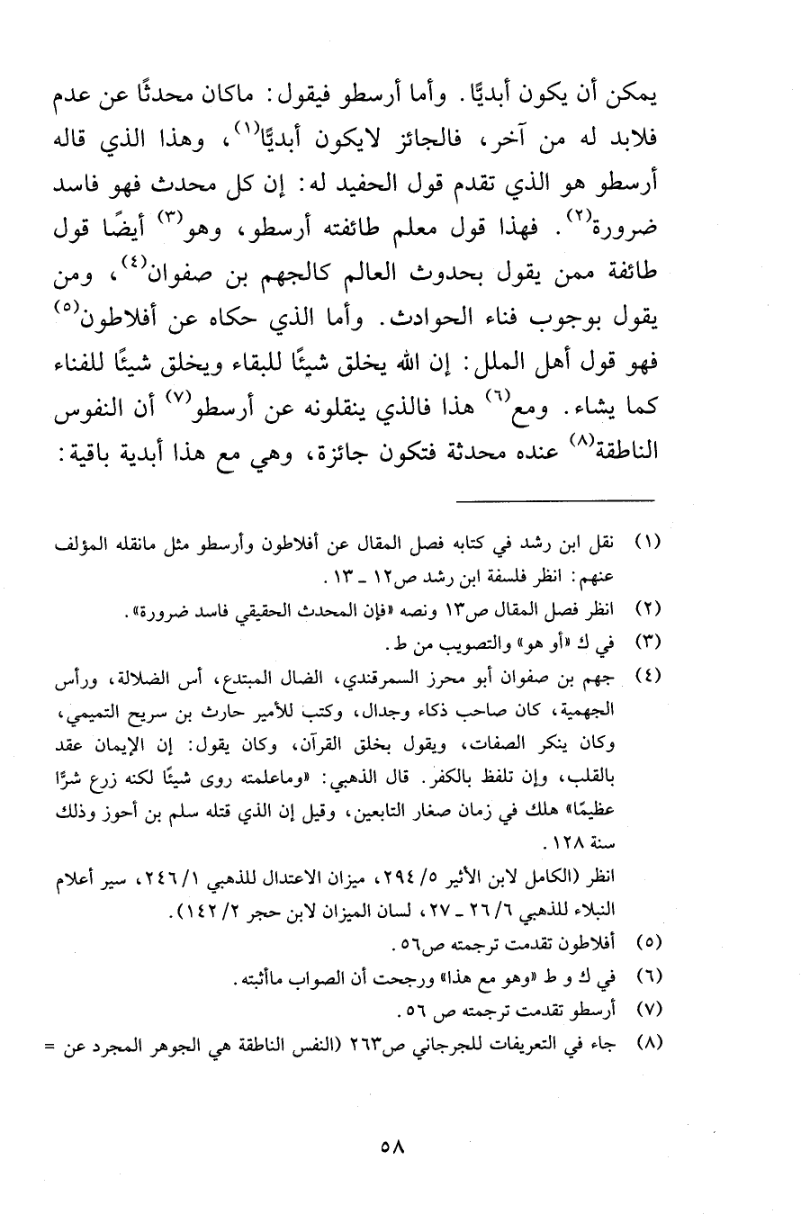 يمكن أن يكون أبديًّا وأما أرسطو فيقول ماكان محدثًا عن عدم فلابد له من آخر فالجائز لايكون أبديًّا وهذا الذي قاله أرسطو هو الذي تقدم قول الحفيد له إن كل محدث فهو فاسد ضرورة فهذا قول معلم طائفته أرسطو وهو أيضًا قول طائفة ممن يقول بحدوث العالم كالجهم بن صفوان ومن يقول بوجوب فناء الحوادث وأما الذي حكاه عن أفلاطون فهو قول أهل الملل إن الله يخلق شيئًا للبقاء ويخلق شيئًا للفناء كما يشاء ومع هذا فالذي ينقلونه عن أرسطو أن النفوس الناطقة عنده محدثة فتكون جائزة وهي مع هذا أبدية باقية