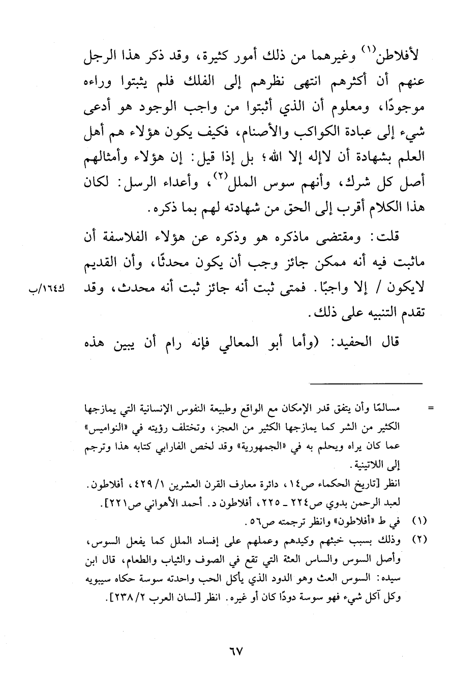 لأفلاطن وغيرهما من ذلك أمور كثيرة وقد ذكر هذا الرجل عنهم أن أكثرهم انتهى نظرهم إلى الفلك فلم يثبتوا وراءه موجودًُا ومعلوم أن الذي أثبتوه من واجب الوجود هو أدعى شيء إلى عبادة الكواكب والأصنام فكيف يكون هؤلاء هم أهل العلم بشهادة أن لا إله إلا الله بل إذا قيل إن هؤلاء وأمثالهم أصل كل شرك وأنهم سوس الملل وأعداء الرسل لكان هذا الكلام أقرب إلى الحق من شهادته لهم بما ذكره قلت ومقتضى ماذكره هو وذكره عن هؤلاء الفلاسفة أن ماثبت فيه أنه ممكن جائز وجب أن يكون محدثًا وأن القديم لايكون إلا واجبًا فمتى ثبت أنه جائز ثبت أنه محدث وقد تقدم التنبيه على ذلك قال الحفيد وأما أبو المعالي فإنه رام أن يبين هذه