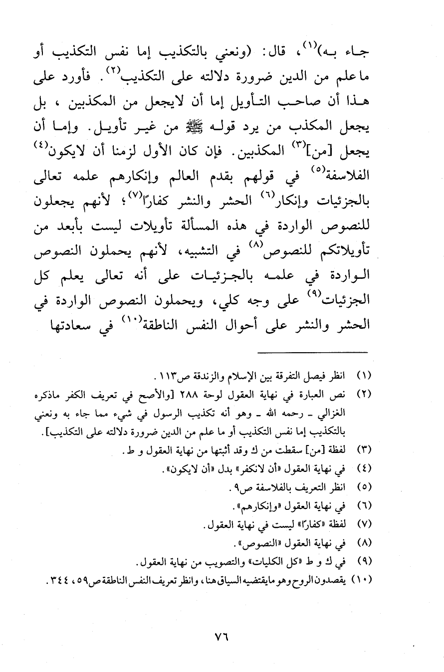 جاء به قال ونعني بالتكذيب إما نفس التكذيب أو ما علم من الدين ضرورة دلالته على التكذيب فأورد على هذا أن صاحب التأويل إما أن لايجعل من المكذبين بل يجعل المكذب من يرد قوله صلى الله عليه وسلم من غير تأويل وإما أن يجعل من المكذبين فإن كان الأول لزمنا أن لايكون الفلاسفة في قولهم بقدم العالم وإنكارهم علمه تعالى بالجزئيات وإنكار الحشر والنشر كفارًا لأنهم يجعلون للنصوص الواردة في هذه المسألة تأويلات ليست بأبعد من تأويلاتكم للنصوص في التشبيه لأنهم يحملون النصوص الواردة في علمه بالجزئيات على أنه تعالى يعلم كل الجزئيات على وجه كلي ويحملون النصوص الواردة في الحشر والنشر على أحوال النفس الناطقة في سعادتها