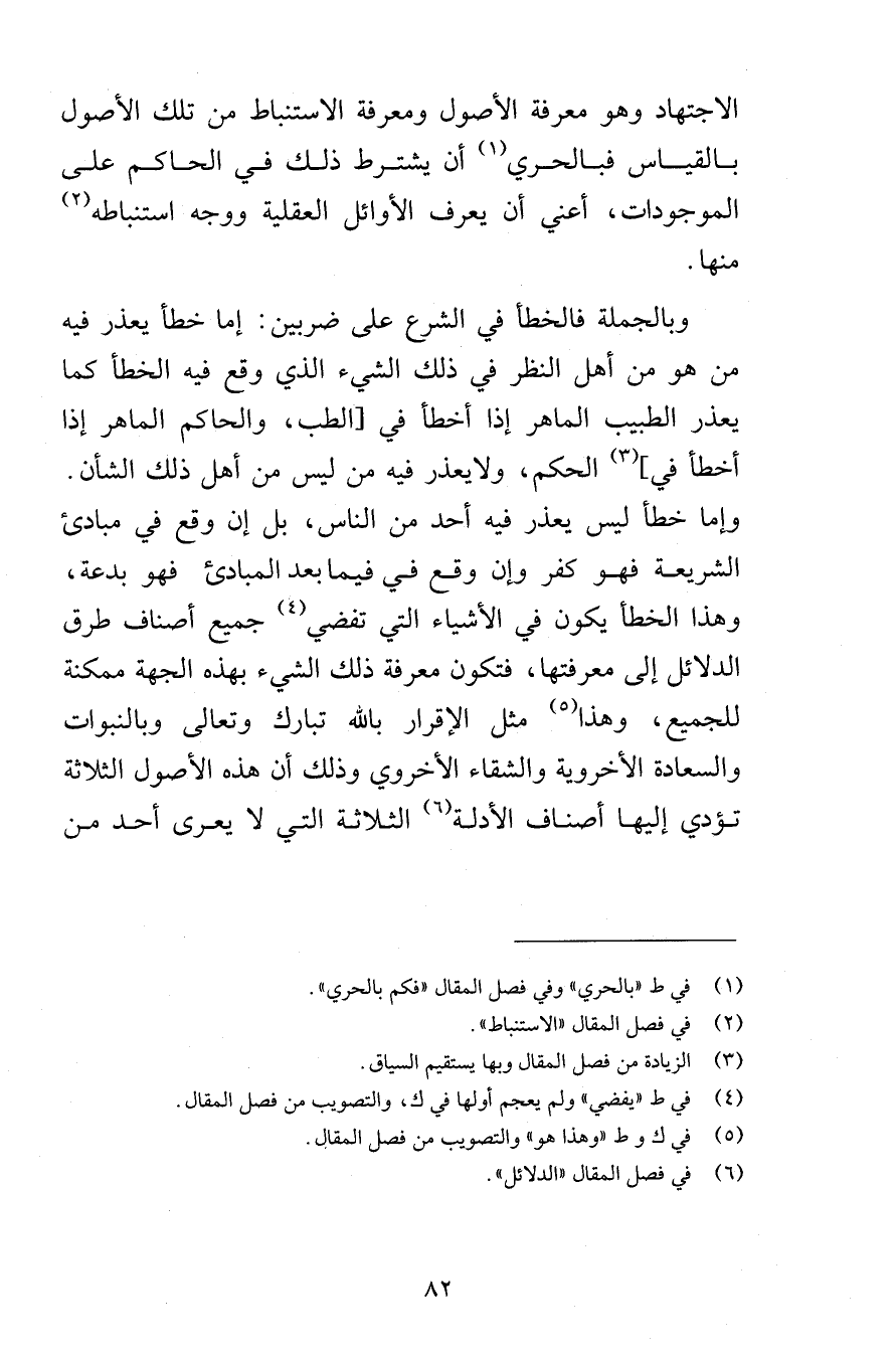 الاجتهاد وهو معرفة الأصول ومعرفة الاستنباط من تلك الأصول بالقياس فبالحري أن يشترط ذلك في الحاكم على الموجودات أعني أن يعرف الأوائل العقلية ووجه استنباطه منها وبالجملة فالخطأ في الشرع على ضربين إما خطأ يعذر فيه من هو من أهل النظر في ذلك الشيء الذي وقع فيه الخطأ كما يعذر الطبيب الماهر إذا أخطأ في الطب والحاكم الماهر إذا أخطأ في الحكم ولايعذر فيه من ليس من أهل ذلك الشأن وإما خطأ ليس يعذر فيه أحد من الناس بل إن وقع في مبادئ الشريعة فهو كفر وإن وقع في فيما بعد المبادئ فهو بدعة وهذا الخطأ يكون في الأشياء التي تفضي جميع أصناف طرق الدلائل إلى معرفتها فتكون معرفة ذلك الشيء بهذه الجهة ممكنة للجميع وهذا مثل الإقرار بالله تبارك وتعالى وبالنبوات والسعادة الأخروية والشقاء الأخروي وذلك أن هذه الأصول الثلاثة تؤدي إليها أصناف الأدلة الثلاثة التي لا يعرى أحد من