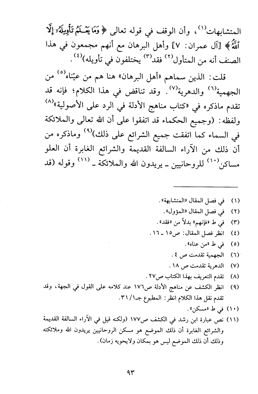 المتشابهات وأن الوقف في قوله تعالى وَمَا يَعْلَمُ تَأْوِيلَهُ إِلاَّ اللهُ [آل عمران 7] وأهل البرهان مع أنهم مجمعون في هذا الصنف أنه من المتأول فقد يختلفون في تأويله قلت الذين سماهم أهل البرهان هنا هم من عيّناه من الجهمية والدهرية وقد تناقض في هذا الكلام فإنه قد تقدم ماذكره في كتاب مناهج الأدلة في الرد على الأصولية ولفظه وجميع الحكماء قد اتفقوا على أن الله تعالى والملائكة في السماء كما اتفقت جميع الشرائع على ذلك وماذكره من أن ذلك من الآراء السالفة القديمة والشرائع الغابرة أن العلو مساكن للروحانيين يريدون الله والملائكة وقوله قد