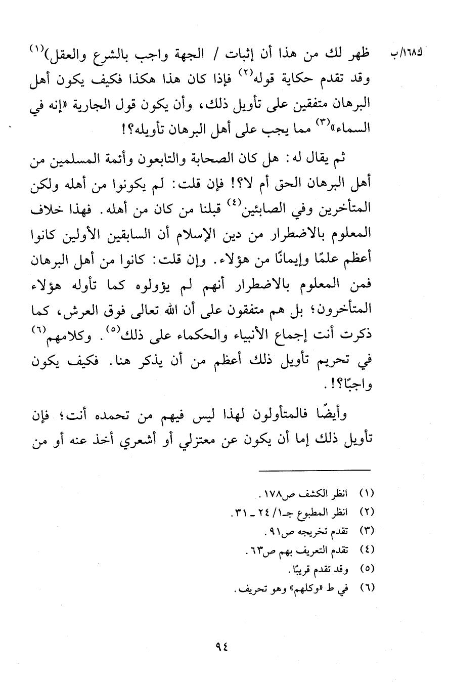 ظهر لكمن هذا أن إثبات الجهة واجب بالشرع والعقل وقد تقدم حكاية قوله فإذا كان هذا هكذا فكيف يكون أهل البرهان متفقين على تأويل ذلك وأن يكون قول الجارية إنه في السماء مما يجب على أهل البرهان تأويله ثم يقال له هل كان الصحابة والتابعون وأئمة المسلمين من أهل البرهان الحق أم لا فإن قلت لم يكونوا من أهله ولكن المتأخرين وفي الصابئين قبلنا من كان من أهله فهذا خلاف المعلوم بالاضطرار من دين الإسلام أن السابقين الأولين كانوا أعظم علمًا وإيمانًا من هؤلاء وإن قلت كانوا من أهل البرهان فمن المعلوم بالاضطرار أنهم لو يؤولوه كما تأوله هؤلاء المتأخرون بل هم متفقون على أن الله تعالى فوق العرش كما ذكرت أنت إجماع الأنبياء والحكماء على ذلك وكلامهم في تحريم تأويل ذلك أعظم من أن يذكر هنا فكيف يكون واجبًا وأيضًا فالمتأولون لهذا ليس فيهم من تحمده أنت فإن تأويل ذلك إما أن يكون عن معتزلي أو أشعري أخذ عنه أو من