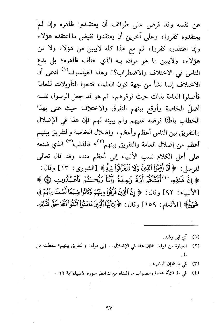 عن نفسه وقد فرض على طوائف أن يعتقدوا ظاهره وإن لم يعتقدوه كفروا وعلى آخرين أن يعتقدوا نقيض ما اعتقده هؤلاء وإن اعتقدوه كفروا ثم مع هذا كله لايبين من هؤلاء ولا من هؤلاء ولايبين ما هو مراده به الذي خالف ظاهره بل يدع الناس في الاختلاف والاضطراب وهذا الفيلسوف ادعى أن الاختلاف إنما نشأ من جهة كون العلماء فتحوا التأويلات للعامة فأضلوا العامة بذلك حيث فرقوهم ثم هو قد جعل الرسول نفسه أضلّ الخاصة وأوقع بينهم التفرق والاختلاف حيث عنى بهذا الخطاب باطنًا فرضه عليهم ولم يبينه لهم فإن هذا في الإضلال والتفريق بين الناس أعظم وأعظم وإضلال الخاصة والتفريق بينهم أعظم من إضلال العامة والتفريق بينهم فالذنب الذي شنعه على أهل الكلام نسب الأنبياء إلى أعظم منه وقد قال تعالى للرسل أَنْ أَقِيمُوا الدِّينَ وَلَا تَتَفَرَّقُوا فِيهِ [الشورى 13] وقال إِنَّ هَذِهِ أُمَّتُكُمْ أُمَّةً وَاحِدَةً وَأَنَا رَبُّكُمْ فَاعْبُدُونِ {92} [الأنبياء 92] وقال إِنَّ الَّذِينَ فَرَّقُواْ دِينَهُمْ وَكَانُواْ شِيَعاً لَّسْتَ مِنْهُمْ فِي شَيْءٍ [الأنعام 159] وقال يَا أَيُّهَا الَّذِينَ آمَنُواْ اتَّقُواْ اللهَ حَقَّ تُقَاتِهِ