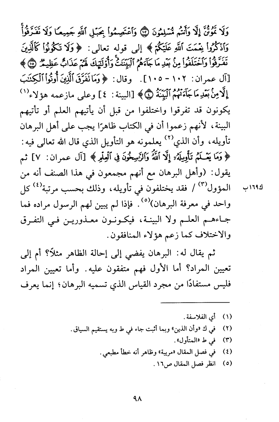 وَلاَ تَمُوتُنَّ إِلاَّ وَأَنتُم مُّسْلِمُونَ {102} وَاعْتَصِمُواْ بِحَبْلِ اللهِ جَمِيعاً وَلاَ تَفَرَّقُواْ وَاذْكُرُواْ نِعْمَتَ اللهِ عَلَيْكُمْ إلى قوله تعالى وَلاَ تَكُونُواْ كَالَّذِينَ تَفَرَّقُواْ وَاخْتَلَفُواْ مِن بَعْدِ مَا جَاءهُمُ الْبَيِّنَاتُ وَأُوْلَئِكَ لَهُمْ عَذَابٌ عَظِيمٌ {105} [آل عمران 102 - 105] وقال وَمَا تَفَرَّقَ الَّذِينَ أُوتُوا الْكِتَابَ إِلَّا مِن بَعْدِ مَا جَاءتْهُمُ الْبَيِّنَةُ {4} [البينة 4] وعلى مازعمه هؤلاء يكونون قد تفرقوا واختلفوا من قبل أن يأتيهم العلم أو تأتيهم البينة لأنهم زعموا أن في الكتاب ظاهرًا يجب على أهل البرهان تأويله وأن الذي يعلمونه هو التأويل الذي قال الله تعالى فيه وَمَا يَعْلَمُ تَأْوِيلَهُ إِلاَّ اللهُ وَالرَّاسِخُونَ فِي الْعِلْمِ [آل عمران 7] ثم يقول وأهل البرهان مع أنهم مجمعون في هذا الصنف أنه من المؤول فقد يختلفون في تأويله وذلك بحسب مرتبة كل واحد في معرفة البرهان فإذا لم يبين لهم الرسول مراده فما جاءهم العلم ولا البينة فيكونون معذورين في التفرق والاختلاف كما زعم هؤلاء المنافقون ثم يقال له البرهان يفضي إلى إحالة الظاهر مثلاً أم إلى تعيين المراد أما الأول فهم متفقون عليه وأما تعيين المراد فليس مستفادًا من مجرد القياس الذي تسميه البرهان إنما يعرف