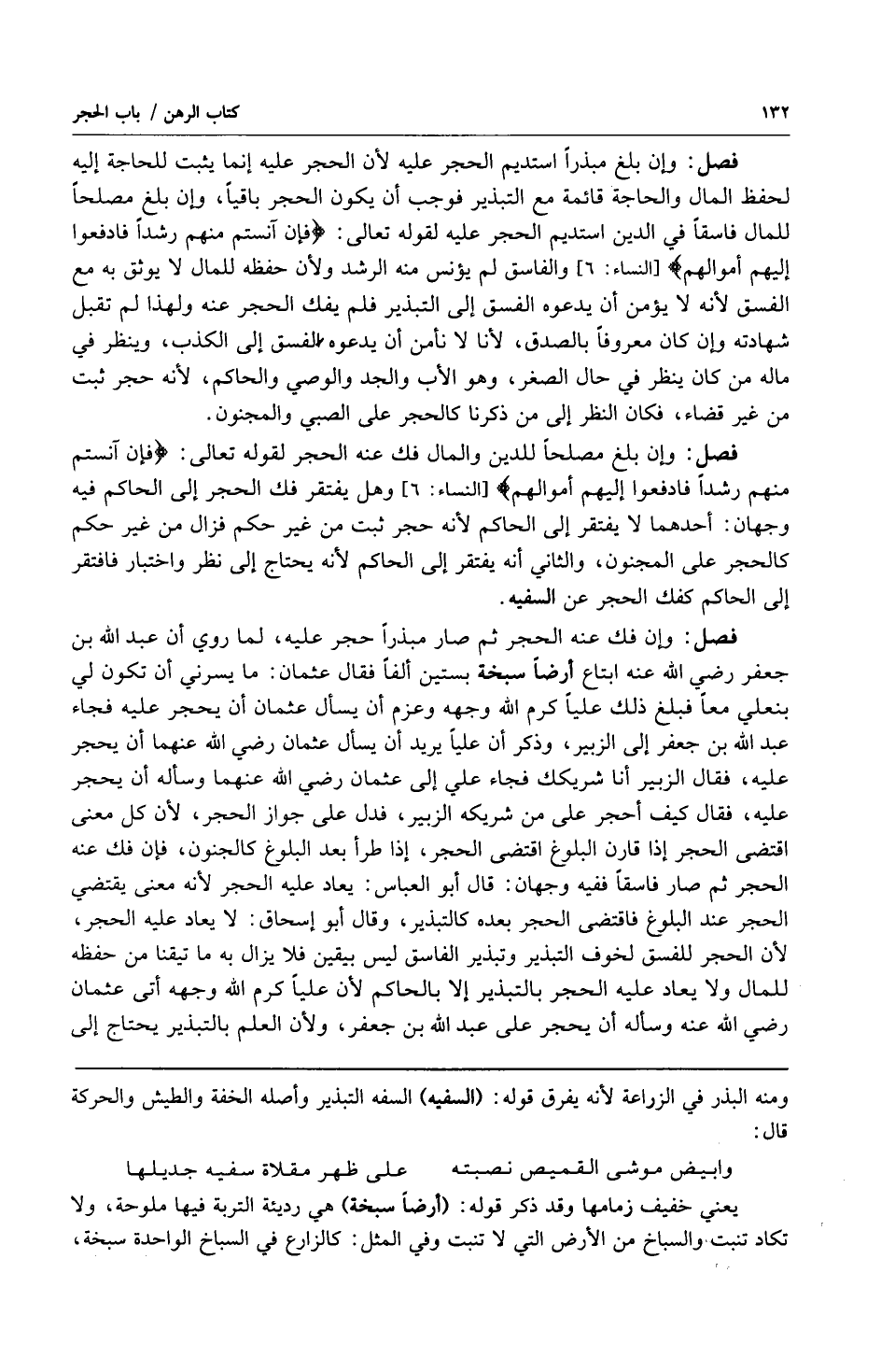فصل: وإن فك عنه الحجر ثم صار مبذراً حجر عليه لما روي أن عبد الله بن جعفر رضي الله عنه ابتاع أرضاً سبخة بستين ألفاً فقال عثمان: ما يسرني أن تكون لي بنعلي معاً فبلغ ذلك علياً كرم الله وجهه وعزم أن يسأل عثمان أن يحجر عليه فجاء عبد الله بن جعفر إلى الزبير وذكر أن علياً يريد أن يسأل عثمان رضي الله عنهما أن يحجر عليه فقال الزبير أنا شريكك فجاء علي إلى عثمان رضي الله عنهما وسأله أن يحجر عليه فقال كيف أحجر على من شريكه الزبير فدل على جواز الحجر لأن كل معنى اقتضى الحجر إذا قارن البلوغ اقتضى الحجر إذا طرأ بعد البلوغ كالجنون فإن فك عنه الحجر ثم صار فاسقاً ففيه وجهان: قال أبو العباس: يعاد عليه الحجر لأنه معنى يقتضي الحجر عند البلوغ فاقتضى الحجر بعده كالتبذير وقال أبو إسحاق: لا يعاد عليه الحجر لأن الحجر للفسق لخوف التبذير وتبذير الفاسق ليس بيقين فلا يزال به ما تيقنا من حفظه للمال ولا يعاد عليه الحجر بالتبذير إلا بالحاكم لأن علياً كرم الله وجهه أتى عثمان رضي الله عنه وسأله أن يحجر على عبد الله بن جعفر ولأن العلم بالتبذير يحتاج إلى