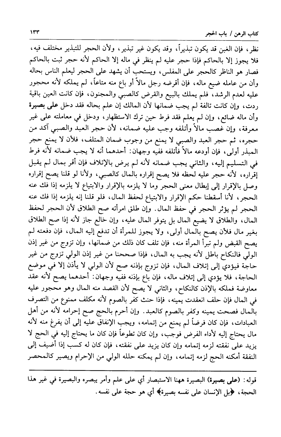 نظر، فإن الغبن قد يكون تبذيراً وقد يكون غير تبذير ولأن الحجر للتبذير مختلف فيه فلا يجوز إلا بالحاكم فإذا حجر عليه لم ينظر في ماله إلا الحاكم لأنه حجر ثبت بالحاكم فصار هو الناظر كالحجر في المفلس ويستحب أن يشهد على الحجر ليعلم الناس بحاله وأن من عامله ضيع ماله فإن أقرضه رجل مالاً أو باع منه متاعاً لم يملكه لأنه محجور عليه لعدم الرشد فلم يملك بالبيع والقرض كالصبي والمجنون فإن كانت العين باقية ردت وإن كانت تالفة لم يجب ضمانها لأن المالك إن علم بحاله فقد دخل على بصيرة وأن ماله ضائع وإن لم يعلم فقد فرط حين ترك الاستظهار ودخل في معاملته على غير معرفة وإن غصب مالاً وأتلفه وجب عليه ضمانه لأن حجر العبد والصبي آكد من حجره ثم حجر العبد والصبي لا يمنع من وجوب ضمان المتلف فلأن لا يمنع حجر المبذر أولى فإن أودعه مالاً فأتلفه ففيه وجهان: أحدهما أنه لا يجب ضمانه لأنه فرط في التسليم إليه والثاني يجب ضمانه لأنه لم يرض بالإتلاف فإن أقر بمال لم يقبل إقراره لأنه حجر عليه لحظه فلا يصح إقراره بالمال كالصبي ولأنا لو قلنا يصح إقراره وصل بالإقرار إلى إبطال معنى الحجر وما لا يلزمه بالإقرار والابتياع لا يلزمه إذا فك عنه الحجر لأنا أسقطنا حكم الإقرار والابتياع لحفظ المال فلو قلنا إنه يلزمه إذا فك عنه الحجر لم يؤثر الحجر في حفظ المال وإن طلق امرأته صح الطلاق لأن الحجر لحفظ المال والطلاق لا يضيع المال بل يتوفر المال عليه وإن خالع جاز لأنه إذا صح الطلاق بغير مال فلأن يصح بالمال أولى ولا يجوز للمرأة أن تدفع إليه المال فإن دفعته لم يصح القبض ولم تبرأ المرأة منه فإن تلف كان ذلك من ضمانها وإن تزوج من غير إذن الولي فالنكاح باطل لأنه يجب به المال فإذا صححنا من غير إذن الولي تزوج من غير حاجة فيؤدي إلى إتلاف المال فإن تزوج بإذنه صح لأن الولي لا يأذن إلا في موضع الحاجة فلا يؤدي إلى إتلاف ماله فإن باع ففيه وجهان: أحدهما يصح لأنه عقد معاوضة فملكه بالإذن كالنكاح والثاني لا يصح لأن القصد منه المال وهو محجور عليه في المال فإن حلف انعقدت يمينه فإذا حنث كفر بالصوم لأنه مكلف ممنوع من التصرف بالمال فصحت يمينه وكفر بالصوم كالعبد وإن أحرم بالحج صح إحرامه لأنه من أهل العبادات فإن كان فرضاً لم يمنع من إتمامه ويجب الإنفاق عليه إلى أن يفرغ منه لأنه مال يحتاج إليه لأداء الفرض فوجب وإن كان تطوعاً فإن كان ما يحتاج إليه في الحج لا يزيد على نفقته لزمه إتمامه وإن كان يزيد على نفقته فإن كان له كسب إذا أضيف إلى النفقة أمكنه الحج لزمه إتمامه وإن لم يكن حلله الولي من الإحرام ويصير كالمحصر