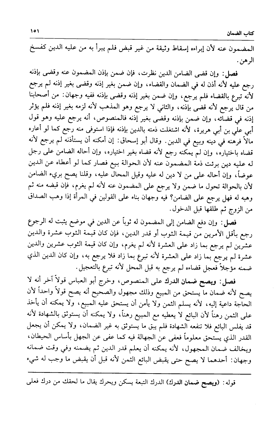 فصل: ويصح ضمان الدرك على المنصوص وخرج أبو العباس قولاً آخر أنه لايصح لأنه ضمان ما يستحق من المبيع وذلك مجهول والصحيح أنه يصح قولاً واحداً لأن الحاجة داعية إليه لأنه يسلم الثمن ولا يأمن أن يستحق عليه المبيع ولا يمكنه أن يأخذ على الثمن رهناً لأن البائع لا يعطيه من المبيع رهناً ولا يمكنه أن يستوثق بالشهادة لأنه قد يفلس البائع فلا تنفعه الشهادة فلم يبق ما يستوثق به غير الضمان ولا يمكن أن يجعل القدر الذي يستحق معلوماً فعفى عن الجهالة فيه كما عفى عن الجهل بأساس الحيطان ويخالف ضمان المجهول لأنه يمكنه أن يعلم قدر الدين ثم يضمنه وفي وقت ضمانه وجهان: أحدهما لا يصح حتى يقبض البائع الثمن لأنه قبل أن يقبض ما وجب له شيء