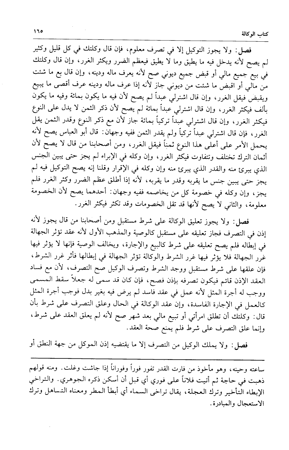 فصل: ولا يجوز التوكيل إلا في تصرف معلوم فإن قال وكلتك في كل قليل وكثير لم يصح لأنه يدخل فيه ما يطيق وما لا يطيق فيعظم الضرر ويكثر الغرر وإن قال وكلتك في بيع جميع مالي أو قبض جميع ديوني صح لأنه عرف ماله ودينه وإن قال بع ما شئت من مالي أو اقبض ما شئت من ديوني جاز لأنه إذا عرف ماله ودينه عرف أقصى ما يبيع ويقبض فيقل الغرر وإن قال اشتر لي عبداً لم يصح لأن فيه ما يكون بمائة وفيه ما يكون بألف فيكثر الغرر وإن قال اشتر لي عبداً بمائة لم يصح لأنه ذكر الثمن لا يدل على النوع فيكثر الغرر وإن قال اشتر لي عبداً تركياً بمائة جاز لأن مع ذكر النوع وقدر الثمن يقل الغرر فإن قال اشتر لي عبداً تركياً ولم يقدر الثمن ففيه وجهان: قال أبو العباس يصح لأنه يحمل الأمر على أعلى هذا النوع ثمناً فيقل الغرر ومن أصحابنا من قال لا يصح لأن أثمان الترك تختلف وتتفاوت فيكثر الغرر وإن وكله في الإبراء لم يجز حتى يبين الجنس الذي يبرئ منه والقدر الذي يبرئ منه وإن وكله في الإقرار وقلنا إنه يصح التوكيل فيه لم يجز حتى يبين جنس ما يقر به وقدر ما يقر به لأنه إذا أطلق عظم الضرر وكثر الغرر فلم يجز وإن وكله في خصومة كل من يخاصمه ففيه وجهان: أحدهما يصح لأن الخصومة معلومة والثاني لا يصح لأنها قد تقل الخصومات وقد تكثر فيكثر الغرر.