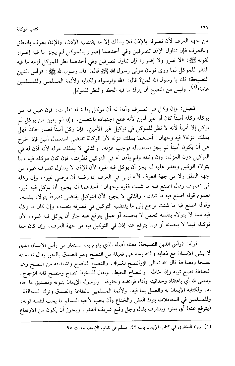 من جهة العرف لأن تصرفه بالإذن فلا يملك إلا ما يقتضيه الإذن والإذن يعرف بالنطق وبالعرف فإن تناول الإذن تصرفين وفي أحدهما إضرار بالموكل لم يجز ما فيه إضرار لقوله صلى الله عليه وسلم: "لا ضرر ولا إضرار" فإن تناول تصرفين وفي أحدهما نظر للموكل لزمه مافيه نظر للموكل لما روى ثوبان مولى رسول الله صلى الله عليه وسلم قال: قال رسول الله صلى الله عليه وسلم: "رأس الدين النصيحة قلنا يارسول الله لمن؟ قال: لله ورسوله ولكتابه ولأئمة المسلمين وللمسلمين عامة1" وليس من النصح أن يترك ما فيه الحظ والنظر للموكل.