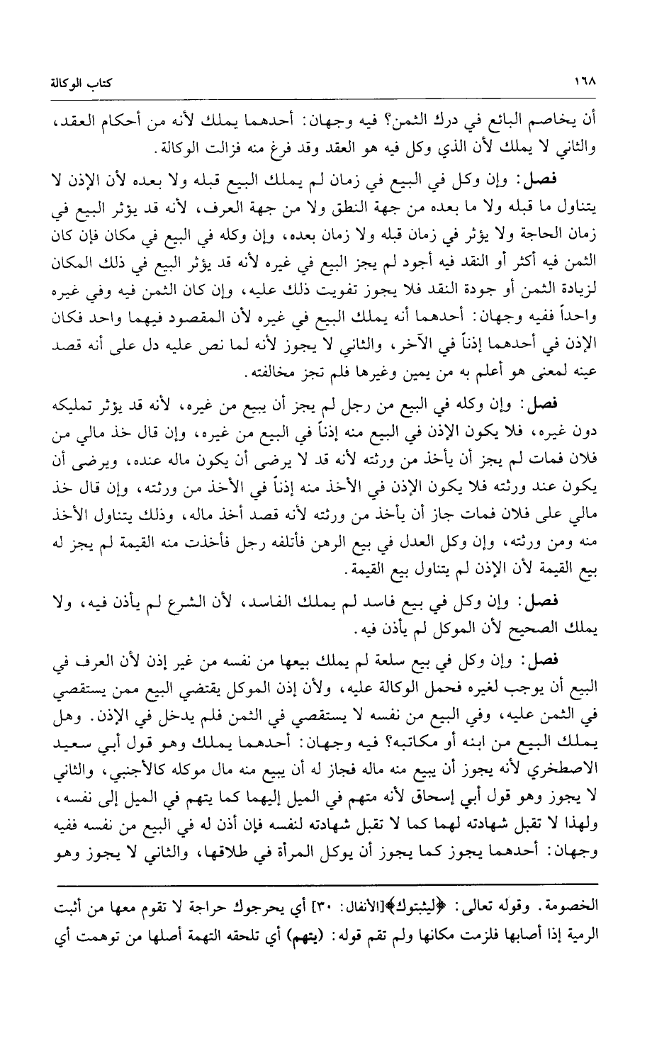 فصل: وإن وكل في البيع في زمان لم يملك البيع قبله ولا بعده لأن الإذن لا يتناول ما قبله ولا ما بعده من جهة النطق ولا من جهة العرف لأنه قد يؤثر البيع في زمان الحاجة ولا يؤثر في زمان قبله ولا زمان بعده وإن وكله في البيع في مكان فإن كان الثمن فيه أكثر أو النقد فيه أجود لم يجز البيع في غيره لأنه قد يؤثر البيع في ذلك المكان لزيادة الثمن أو جودة النقد فلا يجوز تفويت ذلك عليه وإن كان الثمن فيه وفي غيره واحداً ففيه وجهان: أحدهما أنه يملك البيع في غيره لأن المقصود فيهما واحد فكان الإذن في أحدهما إذناً في الآخر والثاني لا يجوز لأنه لما نص عليه دل على أنه قصد عينه لمعنى هو أعلم به من يمين وغيرها فلم تجز مخالفته.