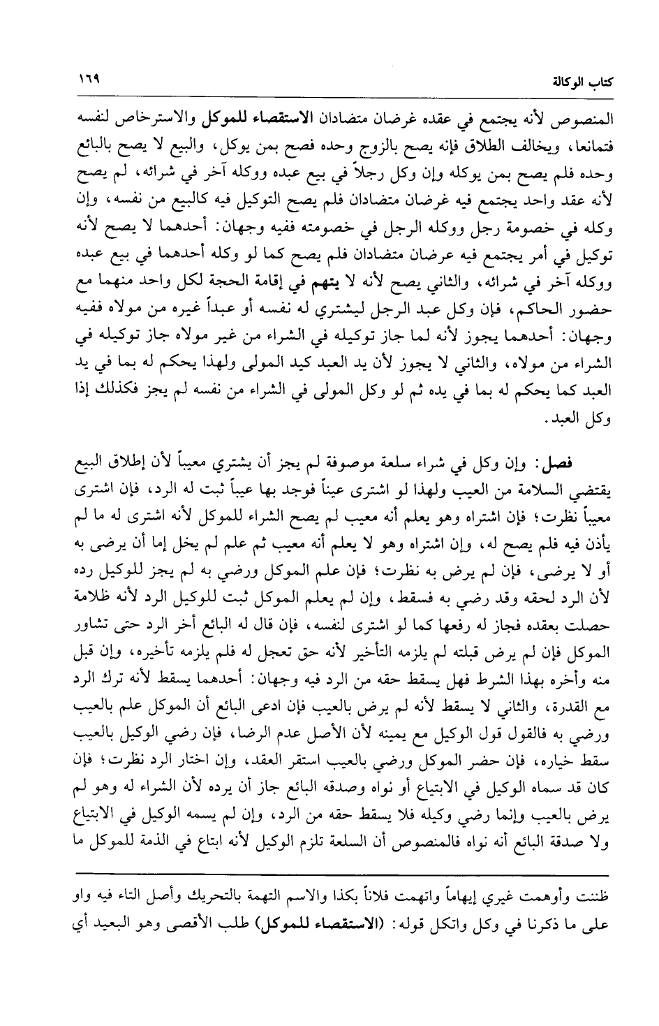 المنصوص لأنه يجتمع في عقده غرضان متضادان الاستقصاء للموكل والاسترخاص لنفسه فتمانعا ويخالف الطلاق فإنه يصح بالزوج وحده فصح بمن يوكل والبيع لا يصح بالبائع وحده فلم يصح بمن يوكله وإن كان رجلاً في بيع عبده ووكله آخر في شرائه لم يصح لأنه عقد واحد يجتمعان فيه غرضان متضادان فلم يصح التوكيل فيه كالبيع من نفسه وإن وكله في خصومة رجل ووكله الرجل في خصومته ففيه وجهان: أحدهما لا يصح لأنه توكيل في أمر يجتمع فيه عرضان متضادان فلم يصح كما لو وكله أحدهما في بيع عبده ووكله آخر في شرائه والثاني يصح لأنه لا يتهم في إقامة الحجة لكل واحد منهما مع حضور الحاكم فإن وكل عبد الرجل ليشتري له نفساً أو عبداً غيره من مولاه ففيه وجهان: أحدهما يجوز لأنه لما جاز توكيله في الشراء من غير مولاه جاز توكيله في الشراء من مولاه والثاني لا يجوز لأن يد العبد كيد المولى ولهذا يحكم له بما في يد العبد كما يحكم له بما في يده ثم لو وكل المولى في الشراء من نفسه لم يجز فكذلك إذا وكل العبد.