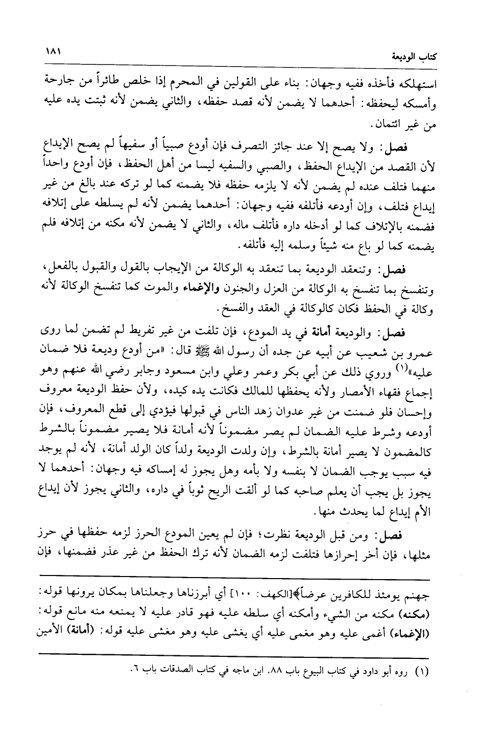 فصل: والوديعة أمانة في يد المودع فإن تلفت من غير تفريط لم تضمن لما روى عمرو بن شعيب عن أبيه عن جده أن رسول الله صلى الله عليه وسلم قال: "من أودع وديعة فلا ضمان عليه1" وروى ذلك أبو بكر وعمر وعلي وابن مسعود وجابر رضي الله عنهم وهو إجماع فقهاء الأمصار ولأنه يحفظها للمالك فكانت يده كيده ولأن حفظ الوديعة معروف وإحسان فلو ضمنت من غير عدوان زهد الناس في قبولها فيؤدي إلى قطع المعروف فإن أودعه وشرط عليه الضمان لم يصر مضموناً لأنه أمانه فلا يصير مضموناً بالشرط كالمضمون لا يصير أمانة بالشرط وإن ولدت الوديعة ولداً كان الولد أمانة لأنه يوجد فيه سبب يوجب الضمان لا بنفسه ولا بأمه وهل يجوز إمساكه فيه وجهان: أحدهما لا يجوز بل يجب أن يعلم صاحبه كما لو ألقت الريح ثوباً في داره والثاني لا يجوز لأن إيداع الأم إيداع لما يحدث منها.