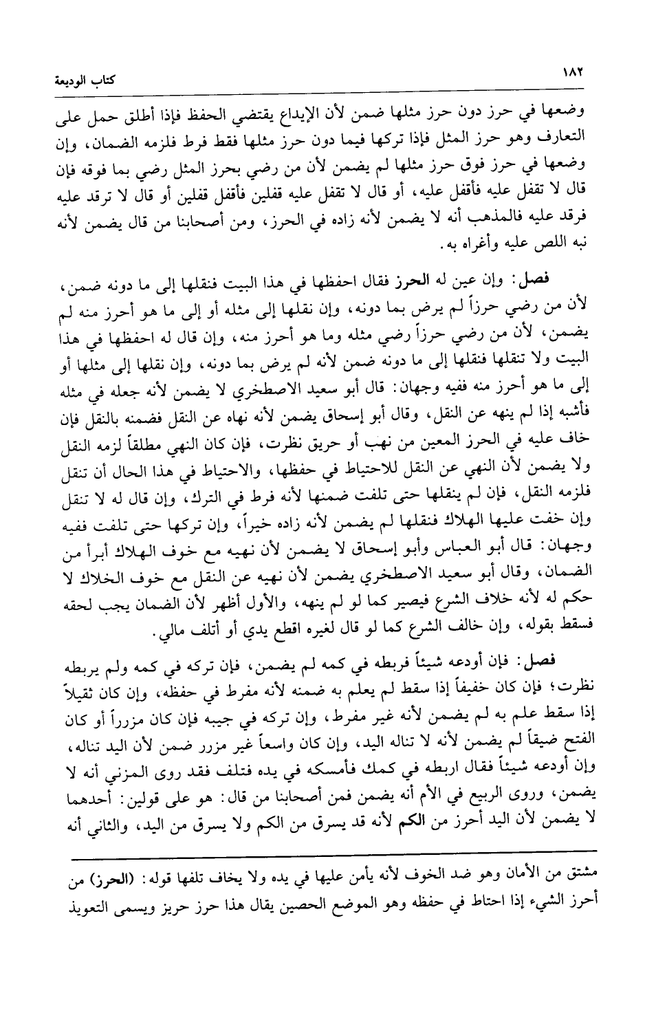 وضعها في حرز دون حرز مثلها ضمن لأن الإيداع يقتضي الحفظ فإذا أطلق حمل على التعارف وهو حرز المثل فإذا تركها فيما دون حرز مثلها فقط فرط فلزمه الضمان وإن وضعها في حرز فوق حرز مثلها لم يضمن لأن من رضي بحرز المثل رضي بما فوقه فإن قال لا تقفل عليه فأقفل عليه أو قال لا تقفل عليه قفلين فأقفل قفلين أو قال لا ترقد عليه فرقد عليه فالمذهب أنه لا يضمن لأنه زاده في الحرز ومن أصحابنا من قال يضمن لأنه نبه اللص عليه وأغراه به.
