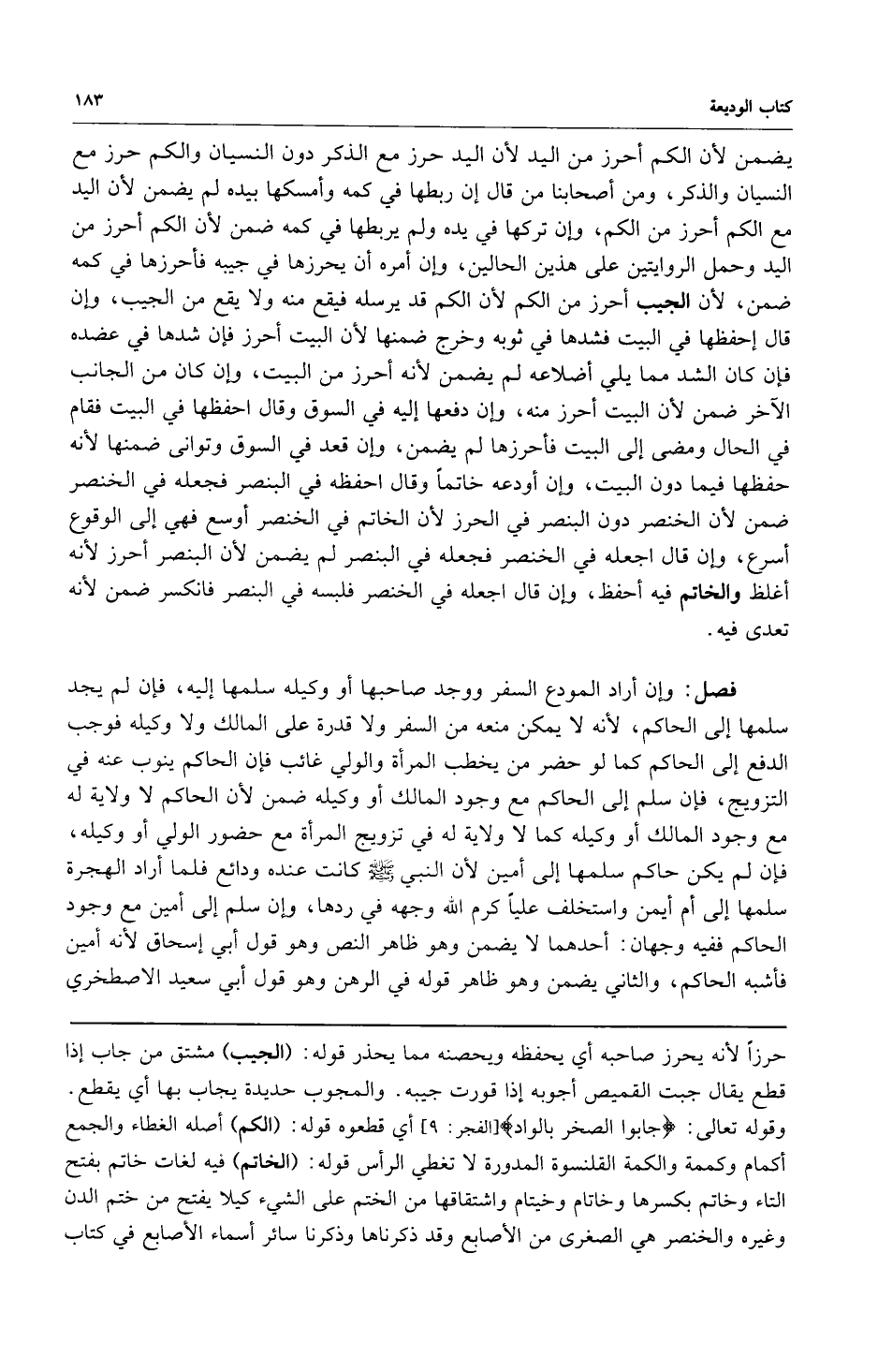 يضمن لأن الكم أحرز من اليد لأن اليد حرز مع الذكر دون النسيان والكم حرز مع النسيان والذكر ومن أصحابنا من قال إن ربطها في كمه وأمسكها بيده لم يضمن لأن اليد مع الكم أحرز من الكم وإن تركها في يده ولم يربطها في كمه ضمن لأن الكم أحرز من اليد وحمل الروايتين على هذين الحالين وإن أمره أن يحرزها في جيبه فأحرزها في كمه ضمن لأن الجيب أحرز من الكم لأن الكم قد يرسله فيقع منه ولا يقع من الجيب وإن قال احفظها في البيت فشدها في ثوبه وخرج ضمنها لأن البيت أحرز فإن شدها في عضده فإن كان الشد مما يلي أضلاعه لم يضمن لأنه أحرز من البيت وإن كان من الجانب الآخر ضمن لأن البيت أحرز منه وإن دفعها إليه في السوق وقال احفظها في البيت فقام في الحال ومضى إلى البيت فأحرزها لم يضمن وإن قعد في السوق وتوانى ضمنها لأنه حفظها فيما دون البيت وإن أودعه خاتماً وقال احفظه في البنصر فجعله في الخنصر ضمن لأن الخنصر دون البنصر في الحرز لأن الخاتم في الخنصر أوسع فهي إلى الوقوع أسرع وإن قال اجعله في الخنصر فجعله في البنصر لم يضمن لأن البنصر أحرز لأنه أغلظ والخاتم فيه أحفظ وإن قال اجعله في الخنصر فلبسه في البنصر فانكسر ضمن لأنه تعدى فيه.