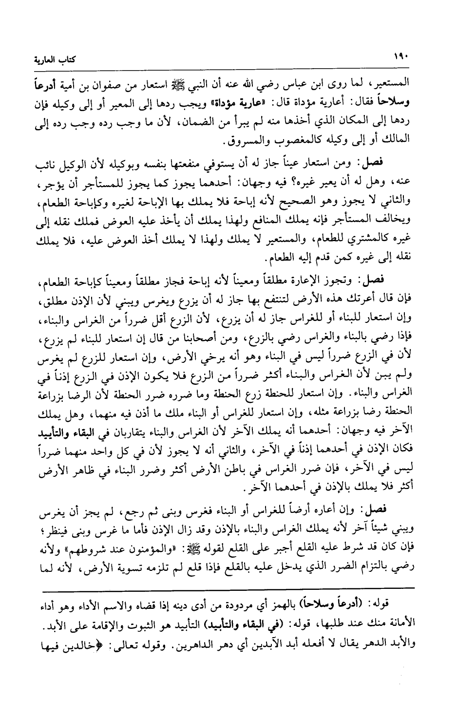 فصل: وتجوز الإعارة مطلقاً ومعيناً لأنه إباحة فجاز مطلقاً ومعيناً كإباحة الطعام فإن قال أعرتك هذه الأرض لتنتفع بها جاز له أن يزرع ويغرس ويبني لأن الإذن مطلق وإن استعار للبناء أو للغرس جاز له أن يزرع لأن الزرع أقل ضرراً من الغراس والبناء فإذا رضي بالبناء والغراس رضي بالزرع ومن أصحابنا من قال إن استعار للبناء لم يزرع لأن في الزرع ضرراً ليس في البناء وهو أنه يرخي الأرض وإن استعار للزرع لم يغرس ولم يبن لأن الغراس والبناء أكثر ضرراً من الزرع فلا يكون الإذن في الزرع إذناً في الغراس والبناء وإن استعار للحنطة زرع الحنطة وما ضرره ضرر الحنطة لأن الرضا بزراعة الحنطة رضا بزراعة مثله وإن استعار للغراس والبناء ملك ما أذن فيه منهما وهل يملك الآخر فيه وجهان: أحدهما أنه يملك الآخر لأن الغراس والبناء يتقاربان في البقاء والتأييد فكان الإذن في أحدهما إذناً في الآخر والثاني أنه لا يجوز لأنه في كل واحد منهما ضرراً ليس في الآخر فإن ضرر الغراس في باطن الأرض أكثر وضرر البناء في ظاهر الأرض أكثر فلا يملك بالإذن في أحدهما الآخر.