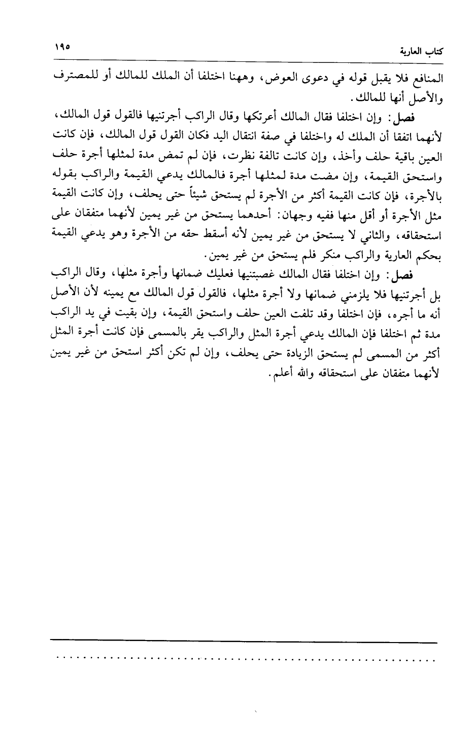فصل: وإن اختلفا فقال المالك أعرتكها وقال الراكب أجرتنيها فالقول قول المالك لأنهما اتفقا أن الملك له واختلفا في صفة انتقال اليد فكان القول قول المالك فإن كانت العين باقية حلف وأخذ وإن كانت تالفة نظرت فإن لم تمض مدة لمثلها أجرة حلف واستحق القيمة وإن مضت مدة لمثلها أجرة فالمالك يدعي القيمة والراكب بقوله بالأجرة فإن كانت القيمة أكثر من الأجرة لم يستحق شيئاً ثم يحلف وإن كانت القيمة مثل الأجرة أو أقل منها ففيه وجهان: أحدهما يستحق من غير يمين لأنهما متفقان على استحقاقه والثاني لا يستحق من غير يمين لأنه أسقط حقه من الأجرة وهو يدعي القيمة بحكم العارية والراكب منكر فلم يستحق من غير يمين.