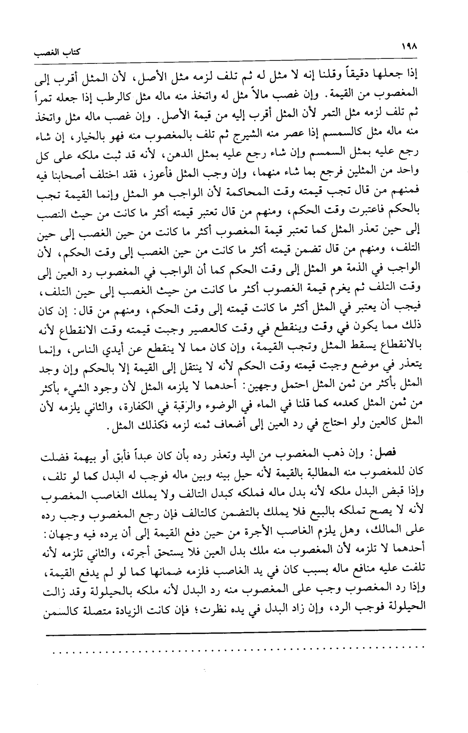 إذا جعلها دقيقاً وقلنا إنه لا مثل له ثم تلف لزمه مثل الأصل لأن المثل أقرب إلى المغصوب من القيمة وإن غصب مالاً مثل له واتخذ منه ماله مثل كالرطب إذا جعله تمراً ثم تلف لزمه مثل التمر لأن المثل أقرب إليه من قيمة الأصل وإن غصب ماله مثل واتخذ منه ماله مثل كالسمسم إذا عصر منه الشيرج ثم تلف بالمغصوب منه فهو بالخيار إن شاء رجع عليه بمثل السمسم وإن شاء رجع عليه بمثل الدهن لأنه قد ثبت ملكه على كل واحد من المثلين فرجع بما شاء منهما وإن وجب المثل فأعوز فقد اختلف أصحابنا فيه فمنهم من قال تجب قيمته وقت المحاكمة لأن الواجب هو المثل وإنما القيمة تجب بالحكم فاعتبرت وقت الحكم ومنهم من قال تعتبر قيمته أكثر ما كانت من حيث النصب إلى حين تعذر المثل كما تعتبر قيمة المغصوب أكثر ما كانت من حين الغصب إلى حين التلف ومنهم من قال تضمن قيمته أكثر ما كانت من حين الغصب إلى وقت الكم لأن الواجب في الذمة هو المثل إلى وقت الحكم كما أن الواجب في المغصوب رد العين إلى وقت التلف ثم يغرم قيمة الغصوب أكثر ما كانت من حيث الغصب إلى حين التلف فيجب أن يعتبر في المثل أكثر ما كانت قيمته إلى وقت الحكم ومنهم من قال: إن كان ذلك مما يكون في وقت وينقطع في وقت كالعصير وجبت قيمته وقت الانقطاع لأنه بالانقطاع يسقط المثل وتجب القيمة وإن كان مما لا ينقطع عن أيدي الناس وإنما يتعذر في موضع وجبت قيمته وقت الحكم لأنه لا ينتقل إلى القيمة إلا بالحكم وإن وجد المثل بأكثر من ثمن المثل احتمل وجهين: أحدهما لا يلزمه المثل لأن وجود الشيء بأكثر من ثمن المثل كعدمه كما قلنا في الماء في الوضوء والرقبة في الكفارة والثاني يلزمه لأن المثل كالعين ولو احتاج في رد العين إلى أضعاف ثمنه لزمه فكذلك المثل.