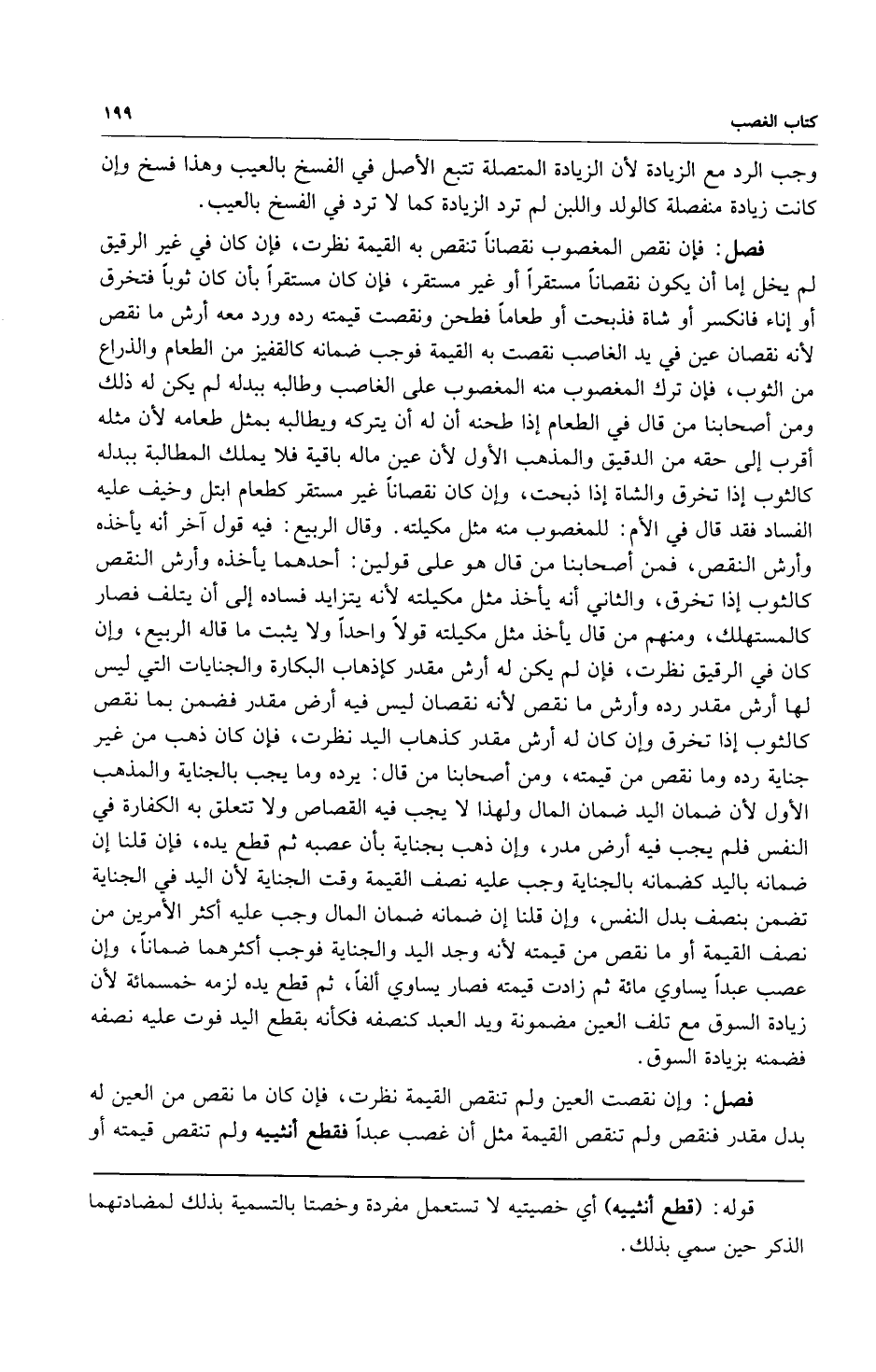 فصل: فإن نقص المغصوب نقصاناً تنقص به القيمة نظرت فإن كان في غير الرقيق لم يخل إما أن يكون نقصاناً مستقراً أو غير مستقر فإن كان مستقراً بأن كان ثوباً فتخرق أو إناء فانكسر أو شاة فذبحت أو طعاماً فطحن ونقصت قيمته رده ورد معه أرش ما نقص لأن نقصان عين في يد الغاصب نقصت به القيمة فوجب ضمانه كالقفيز من الطعام والذراع من الثوب فإن ترك المغصوب منه المغصوب على الغاصب وطالبه ببدله لم يكن له ذلك ومن أصحابنا من قال في الطعام إذا طحنه أن له أن يتركه ويطالب بمثل طعامه لأن مثله أقرب إلى حقه من الدقيق والمذهب الأول لأن عين ماله باقية فلا يملك المطالبة ببدله كالثوب إذا تخرق والشاة إذا ذبحت وإن كان نقصاناً غير مستقر كطعام ابتل وخيف عليه الفساد فقد قال في الأم: للمغصوب منه مثل مكيلته وقال الربيع: فيه قول آخر أن يأخذه وأرش النقص فمن أصحابنا من قال هو على قولين: أحدهما يأخذه وأرش النقص كالثوب إذا تخرق والثاني أنه ياخذ مثل مكيلته لأنه يتزايد فساده إلى أن يتلف فصار كالمستهلك ومنهم من قال يأخذ مثل مكيلته قولاً واحداً ولا يثبت ما قاله الربيع وإن كان في الرقيق نظرت فإن لم يكن له أرش مقدر كإذهاب البكارة والجنايات التي ليس لها أرش مقدر رده وأرش ما نقص لأنه نقصان ليس فيه أرض مقدر فضمن بما نقص كالثوب إذا تخرق وإن كان له أرش مقدر كذهاب اليد نظرت فإن كان ذهب من غير جناية رده وما نقص من قيمته ومن أصحابنا من قال: يرده وما يجب بالجناية والمذهب الأول لأن ضمان اليد ضمان المال ولهذا لا يجب فيه القصاص ولا تتعلق به الكفارة في النفس فلم يجب فيه أرض مدر وإن ذهب بجناية بأن عصبه ثم قطع يده فإن قلنا إن ضمانه باليد كضمانه بالجناية وجب عليه نصف القيمة وقت الجناية لأن اليد في الجناية تضمن بنصف بدل النفس وإن قلنا إن ضمانه ضمان المال وجب عليه أكثر الأمرين من نصف القيمة أو ما نقص من قيمته لأنه وجد اليد والجناية فوجب أكثرهما ضماناً وإن عصب عبداً يساوي مائة ثم زادت قيمته فأصبح يساوي ألفاً ثم قطع يده لزمه خمسمائة لأن زيادة السوق مع تلف العين مضمونة ويد العبد كنصفه فكأنه بقطع اليد فوت عليه نصفه فضمنه بزيادة السوق.