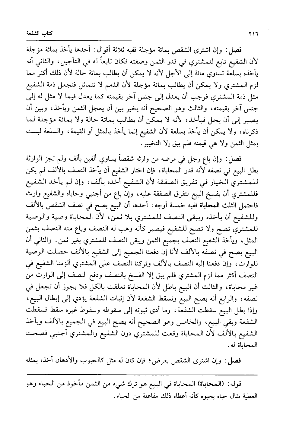 فصل: وإن باع رجل من وارثه شقصاً يساوي ألفين بألف ولم تجز الوراثة بطل البيع في نصفه لأنه قدر المحاباة فإن اختار الشفيع أن يأخذ النصف بالألف لم يكن للمشتري الخيار في تفريق الصفقة لأن الشفيع أخذه بألف وإن لم يأخذ الشفيع فللمشتري أن يفسخ البيع لتفرق الصفقة عليه وإن باع من أجنبي وحاباه والشفيع وارث فاحتمل الثلث المحاباة ففيه خمسة أوجه: أحدها أن البيع يصح في نصف الشقص بالألف وللشفيع أن يأخذه ويبقى النصف للمشتري بلا ثمن لأن المحاباة وصية والوصية للمشتري تصح ولا تصح للشفيع فيصير كأنه وهب له النصف وباع منه النصف بثمن المثل ويأخذ الشفيع النصف بجميع الثمن ويبقى النصف للمشتري بغير ثمن والثاني أن البيع يصح في نصفه بالألف لأنا لو دفعنا الجميع إلى الشفيع بالألف حصلت الوصية للوارث وإن دفعنا إليه النصف بالألف وتركنا النصف على المشتري ألزمنا الشفيع في النصف أكثر مما لزم المشتري فلم يبق إلا الفسخ بالنصف ودفع النصف إلى الوارث من غير محاباة والثالث أن البيع باطل لأن المحاباة تعلقت بالكل فلا يجوز أن تجعل في نصفه والرابع أنه يصح البيع وتسقط الشفعة لأن إثبات الشفعة يؤدي إلى إبطال البيع وإذا بطل البيع سقطت الشفعة وما أدى ثبوته إلى سقوطه وسقوط غيره سقط فسقطت الشفعة وبقي البيع والخامس وهو الصحيح أنه يصح البيع في الجميع بالألف ويأخذ الشفيع بالألف لأن المحاباة وقعت للمشتري دون الشفيع والمشتري أجنبي فصحت المحاباة له.